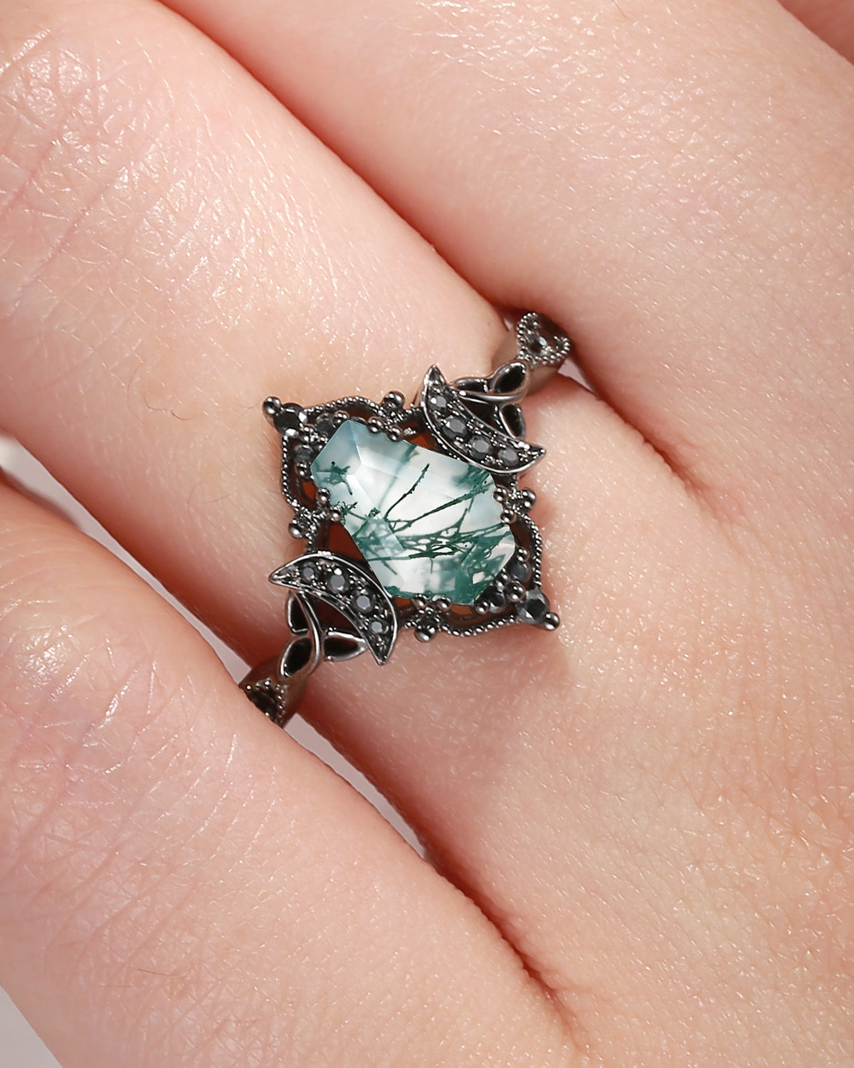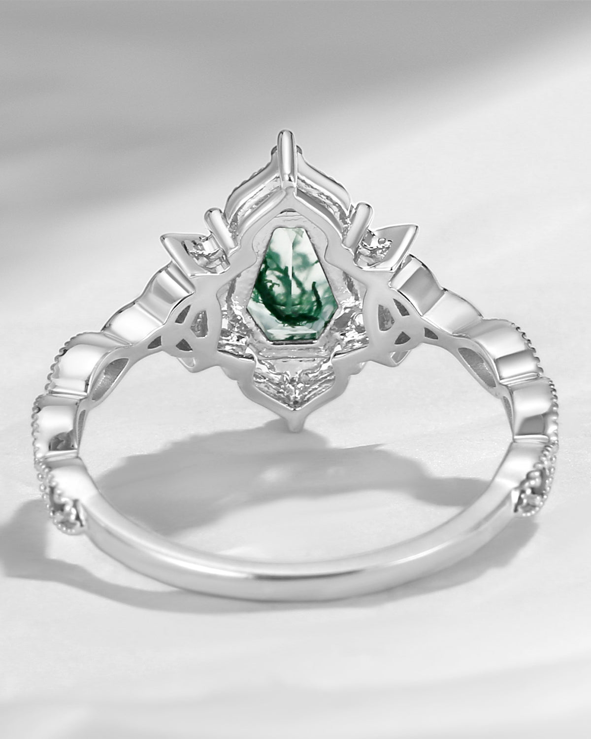 • Design - Two delicately detailed crescent moons around the unique coffin-cut stone, with vintage inspired clustered milgrain band. Truly one-of-a-kind. • It Says - Till Death Do Us Part.