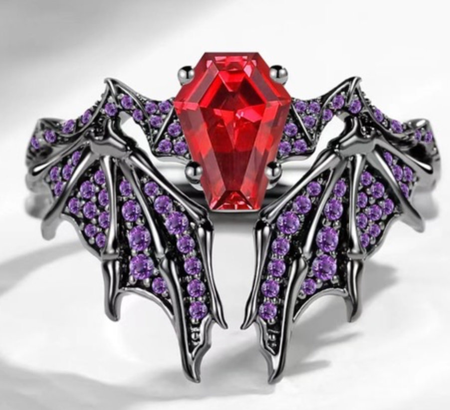 Coffin Cut Pink Lab Diamond Spooky Engagement Ring Set 2pcs - Dainty Bat Ring