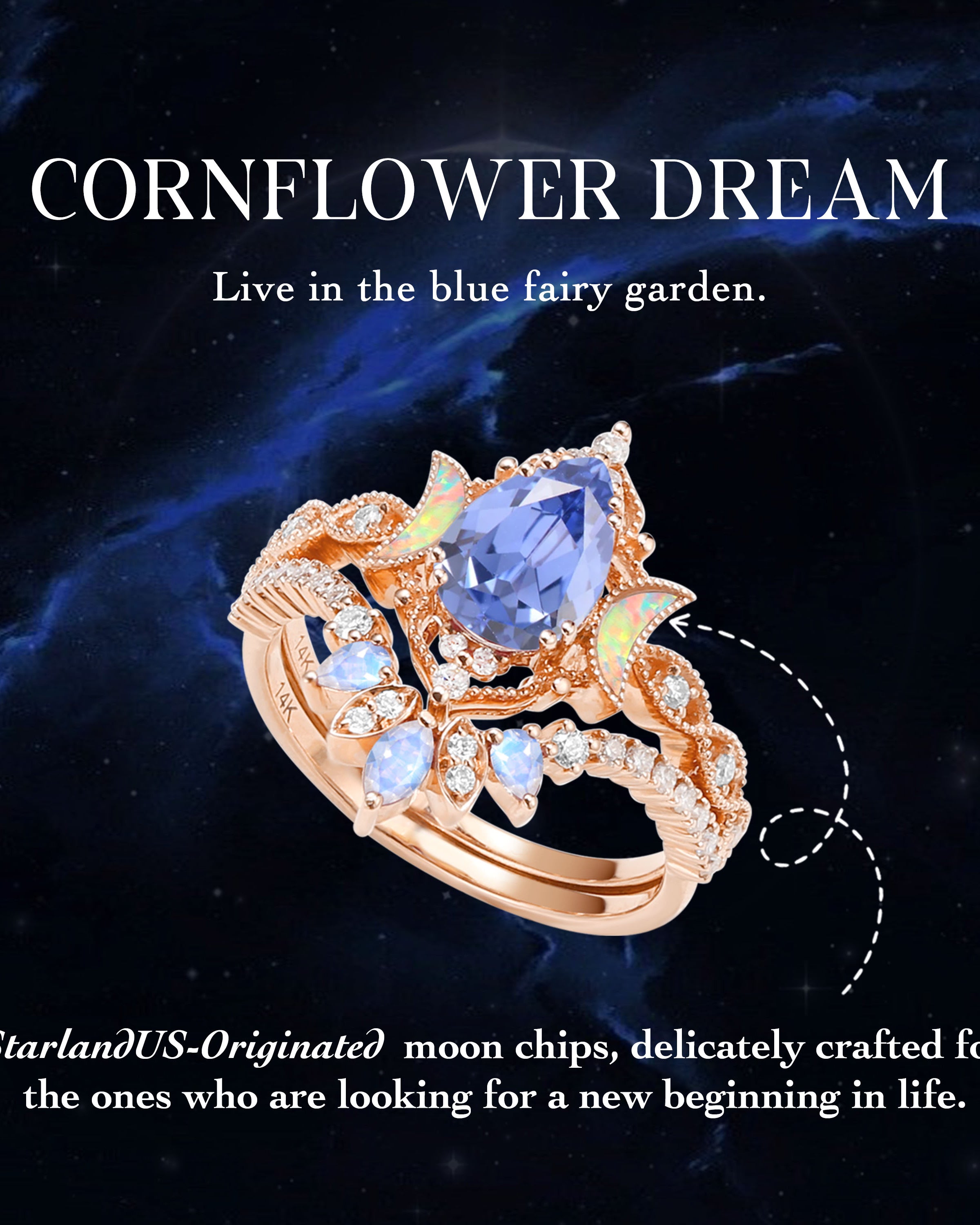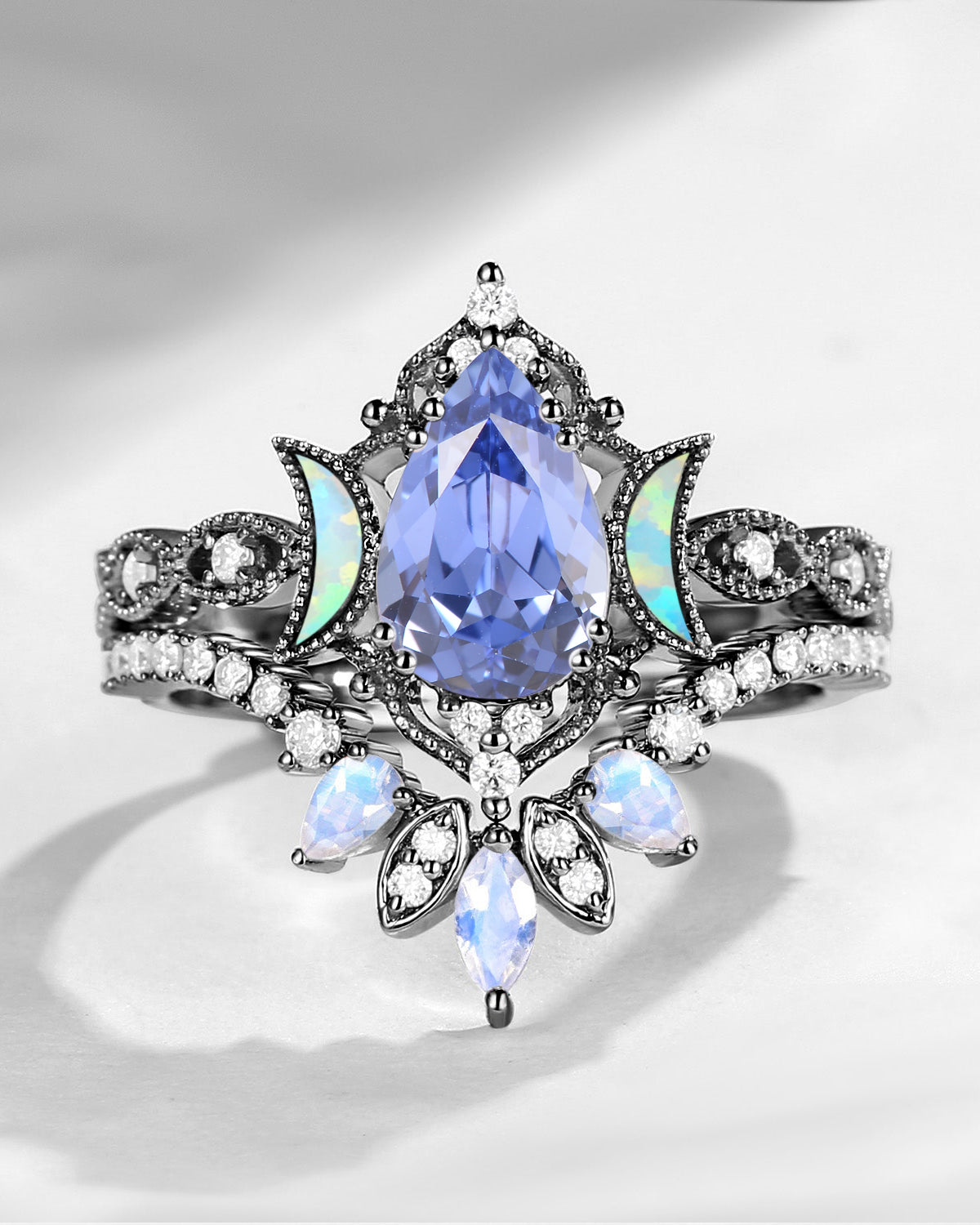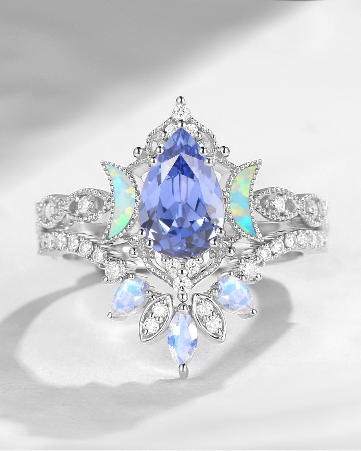 Crescent Moon | Pear Cut Blue Sandstone 'Ultra Galaxy' Engagement Ring Set 2pcs
