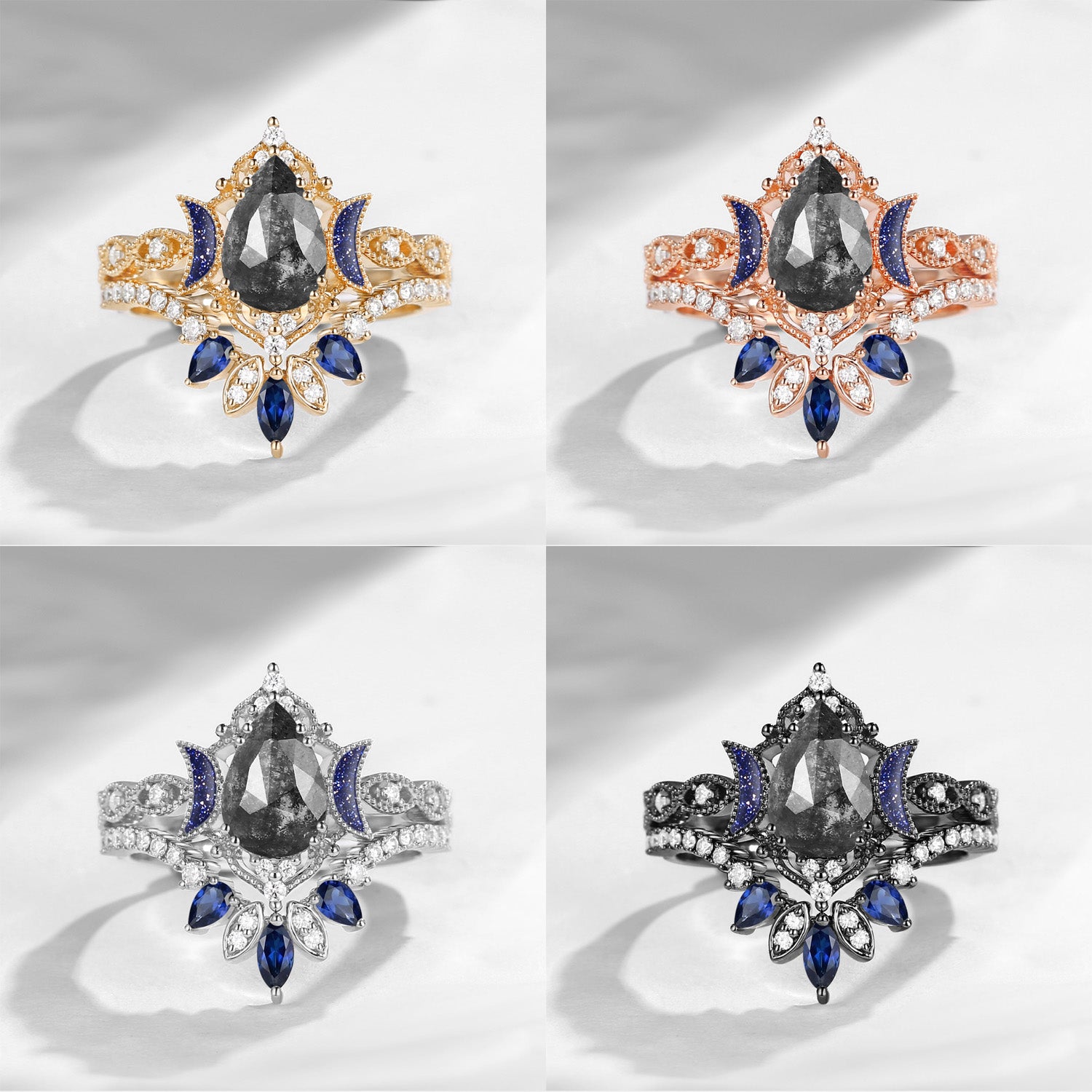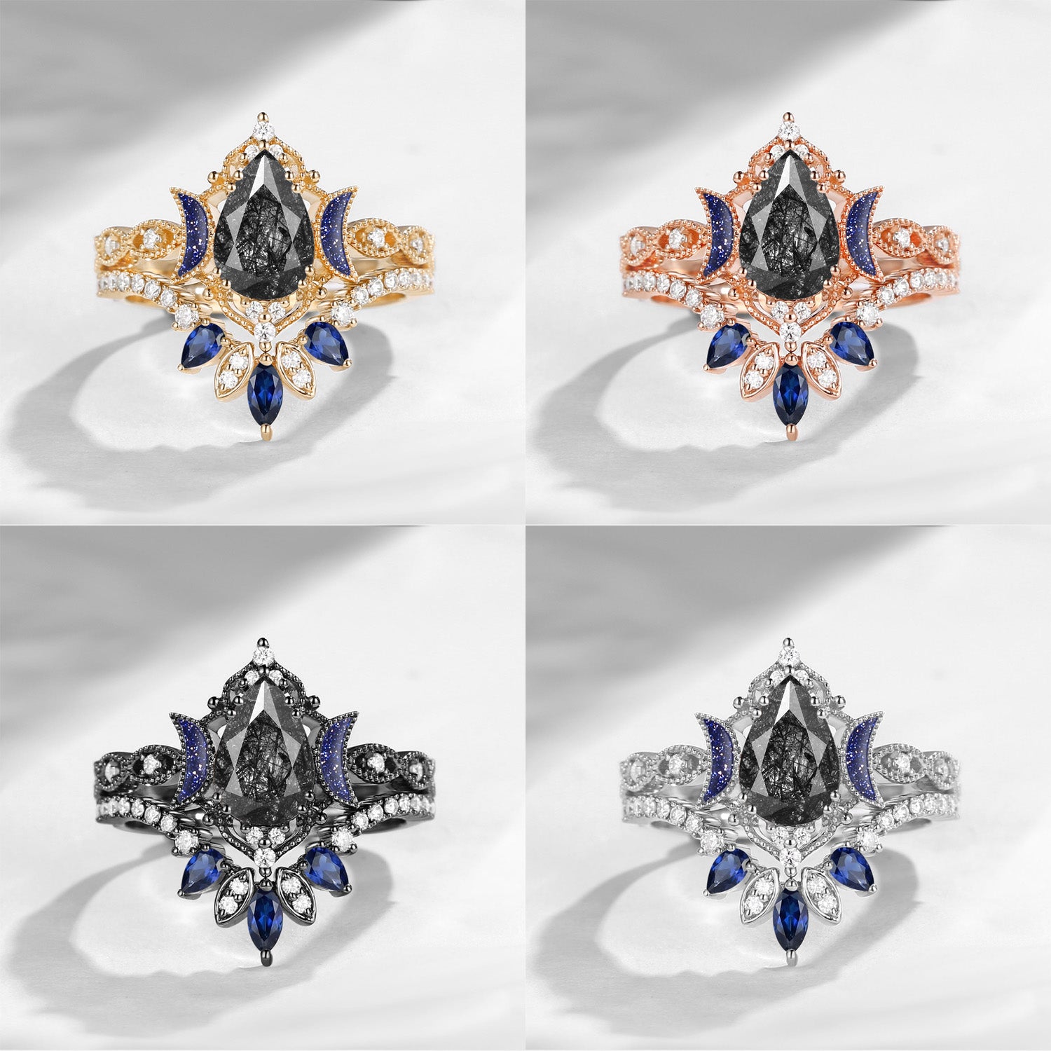 Crescent Moon | Pear Cut Blue Sandstone 'Ultra Galaxy' Black Gold Engagement Ring Set 2pcs