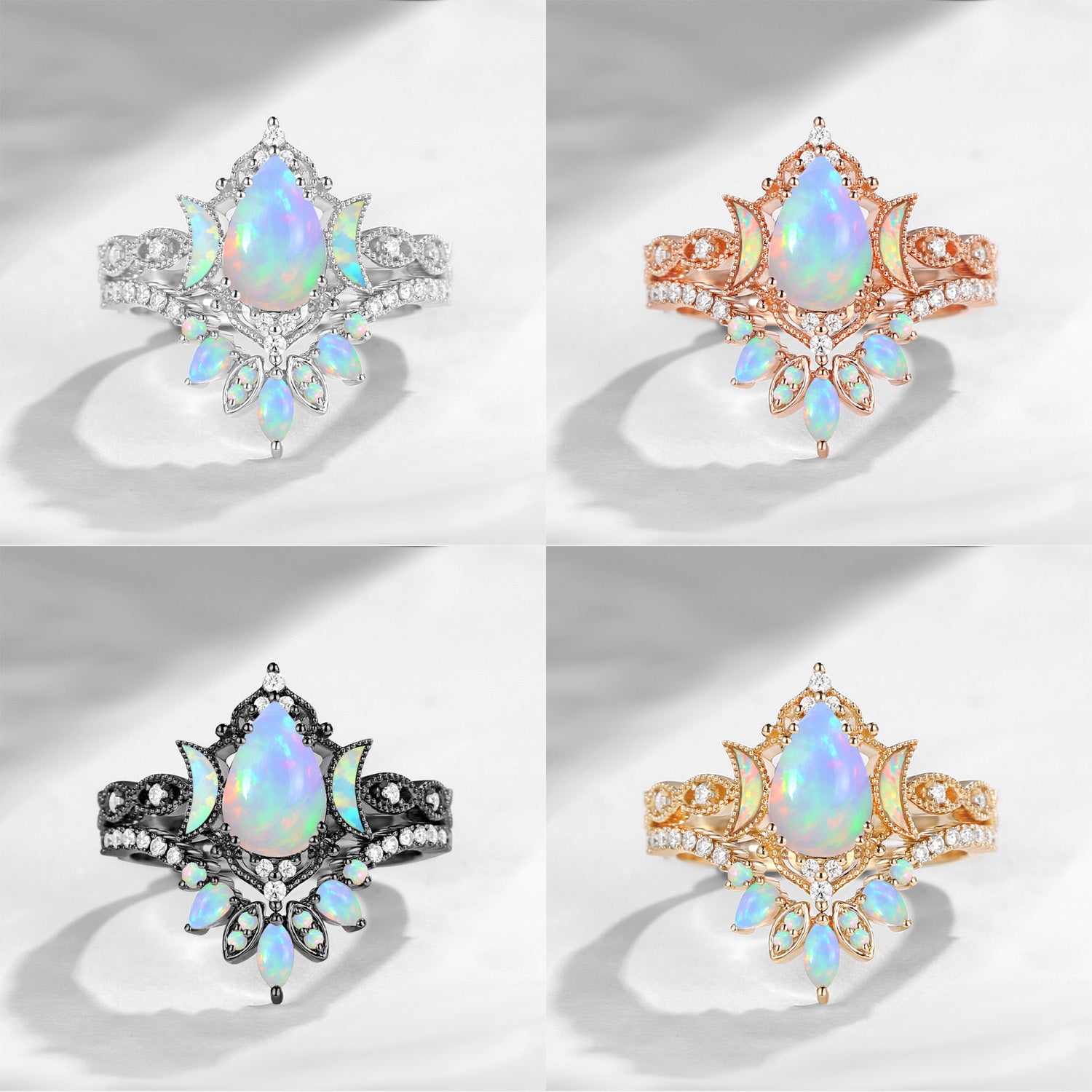 Crescent Moon | Pear Cut Natural Opal 'Ultra Galaxy' Engagement Ring Set 2pcs