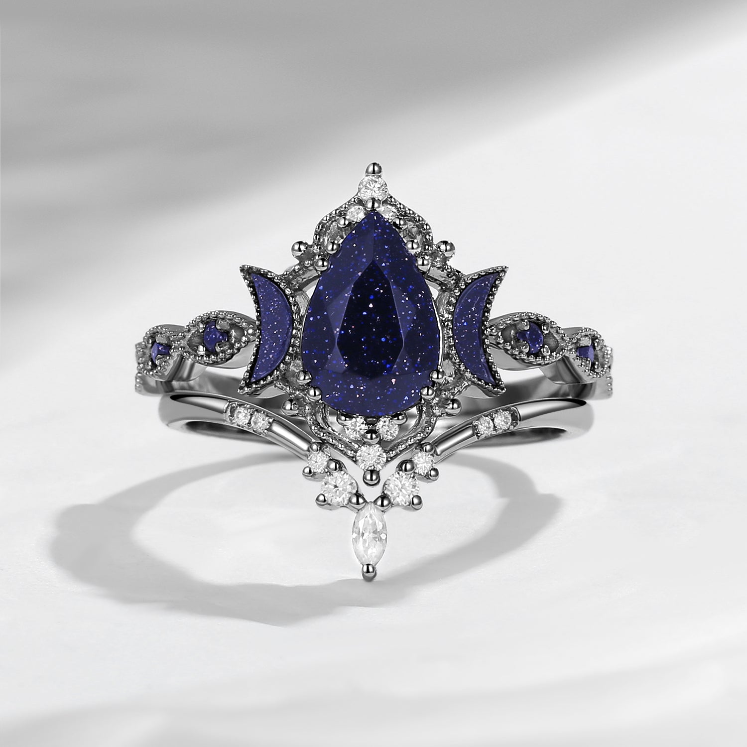 Crescent Moon | Pear Cut Blue Sandstone 'Ultra Galaxy' Engagement Ring Set 2pcs