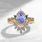 Pear Cut Lab Cornflower Sapphire & Moss Agate Engagement Ring Infinity Ring Vintage Style Cluster Moon Wedding Ring Set 2pcs