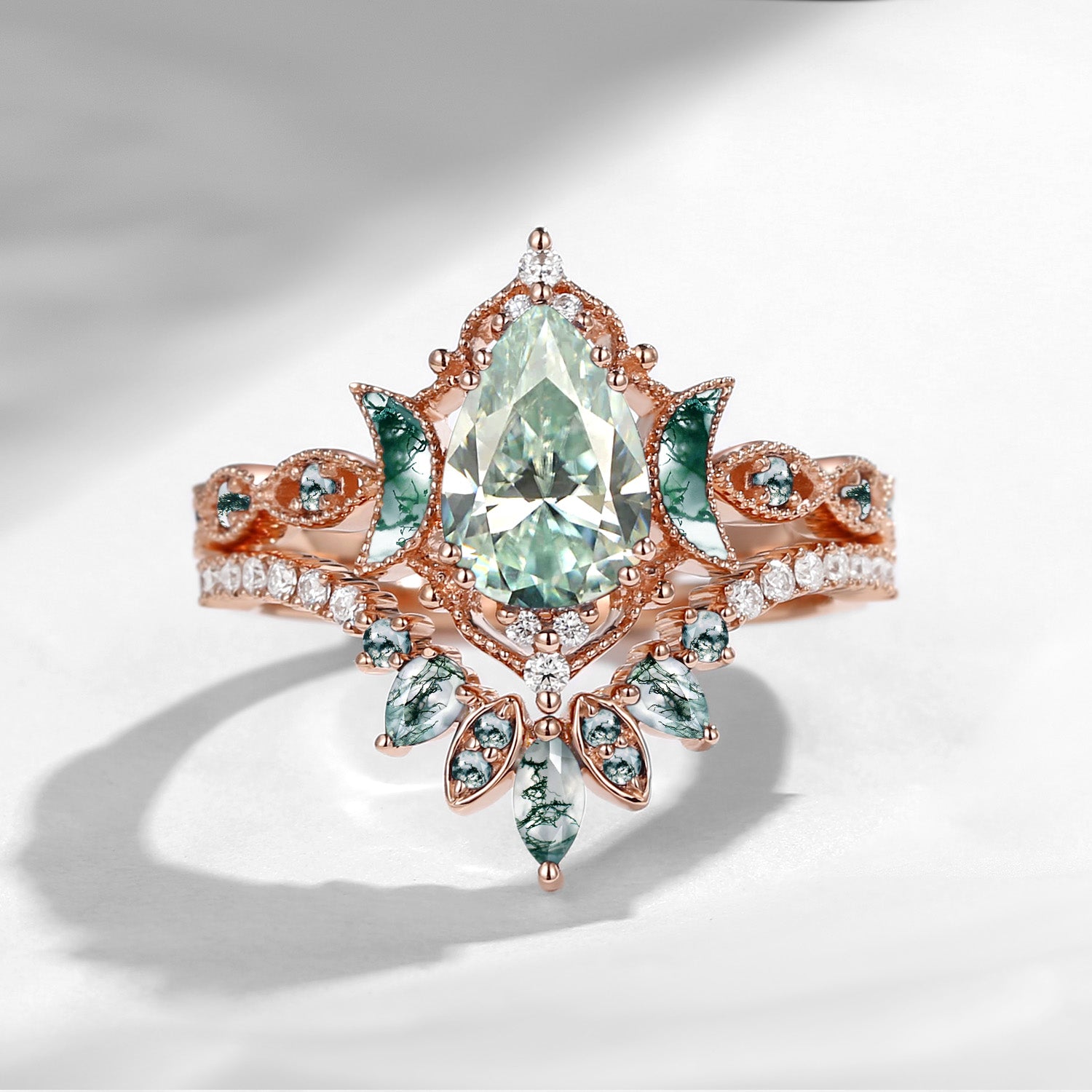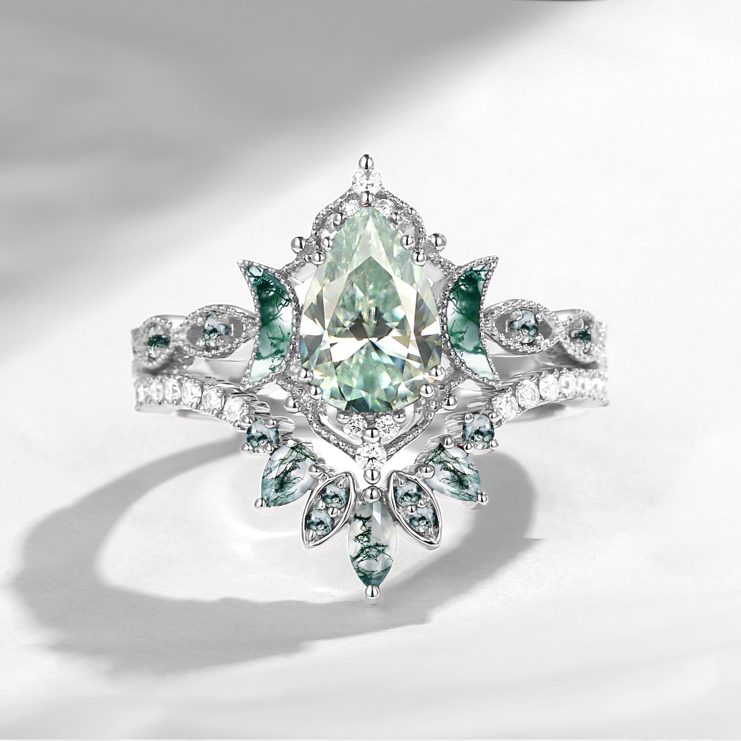 Crescent Moon | Pear Cut Mint Moissanite 'Ultra Galaxy' Engagement Ring Set 2pcs