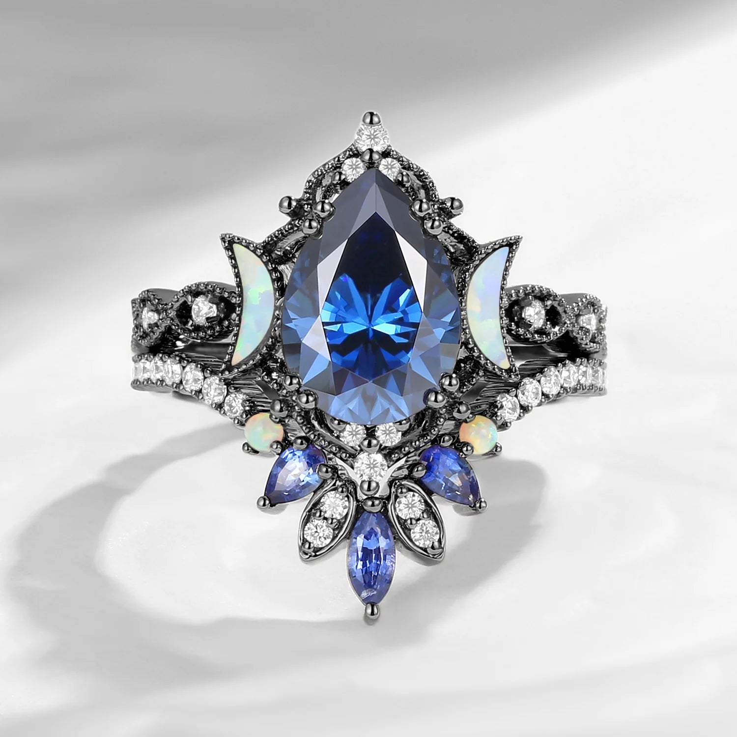 Crescent Moon | Pear Cut Royal Blue Moissanite 'Ultra Galaxy' Black Gold Engagement Ring Set 2pcs