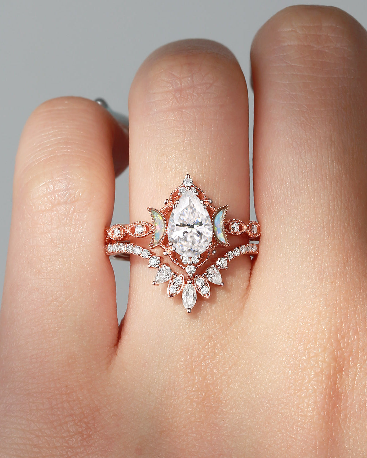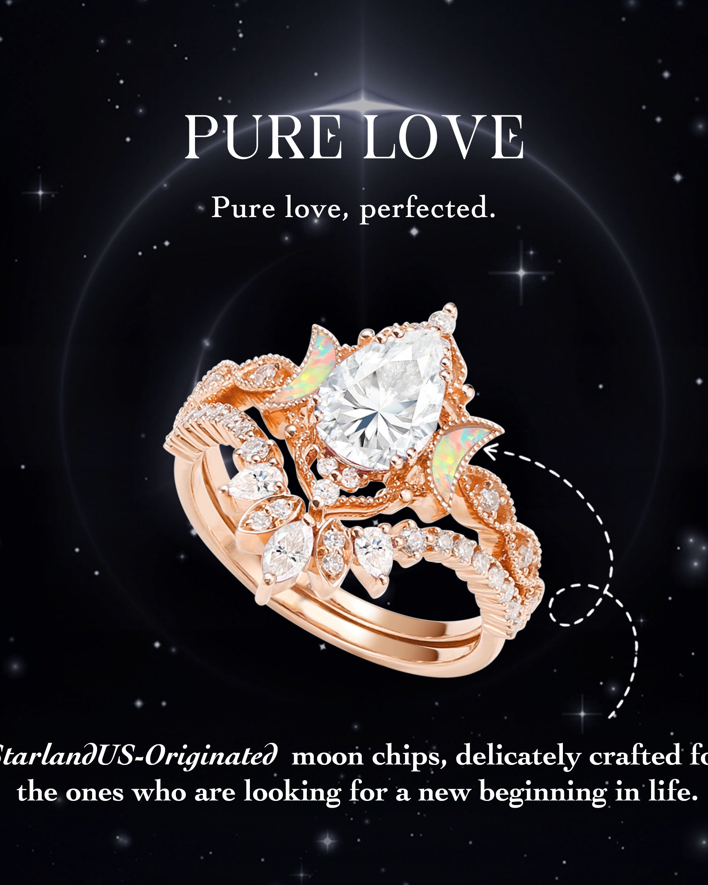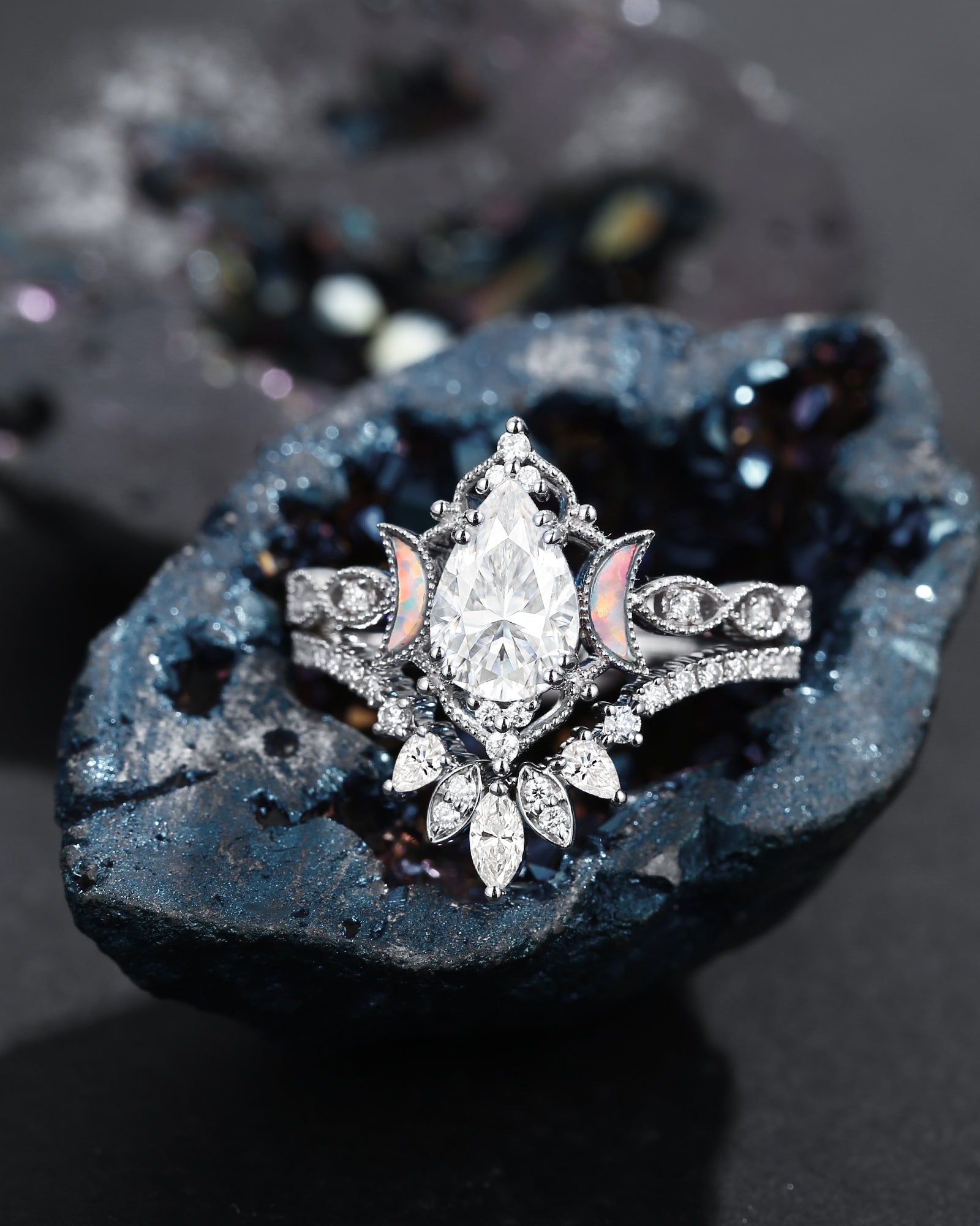 Crescent Moon | Pear Cut Moissanite 'Ultra Galaxy' Engagement Ring Set 2pcs