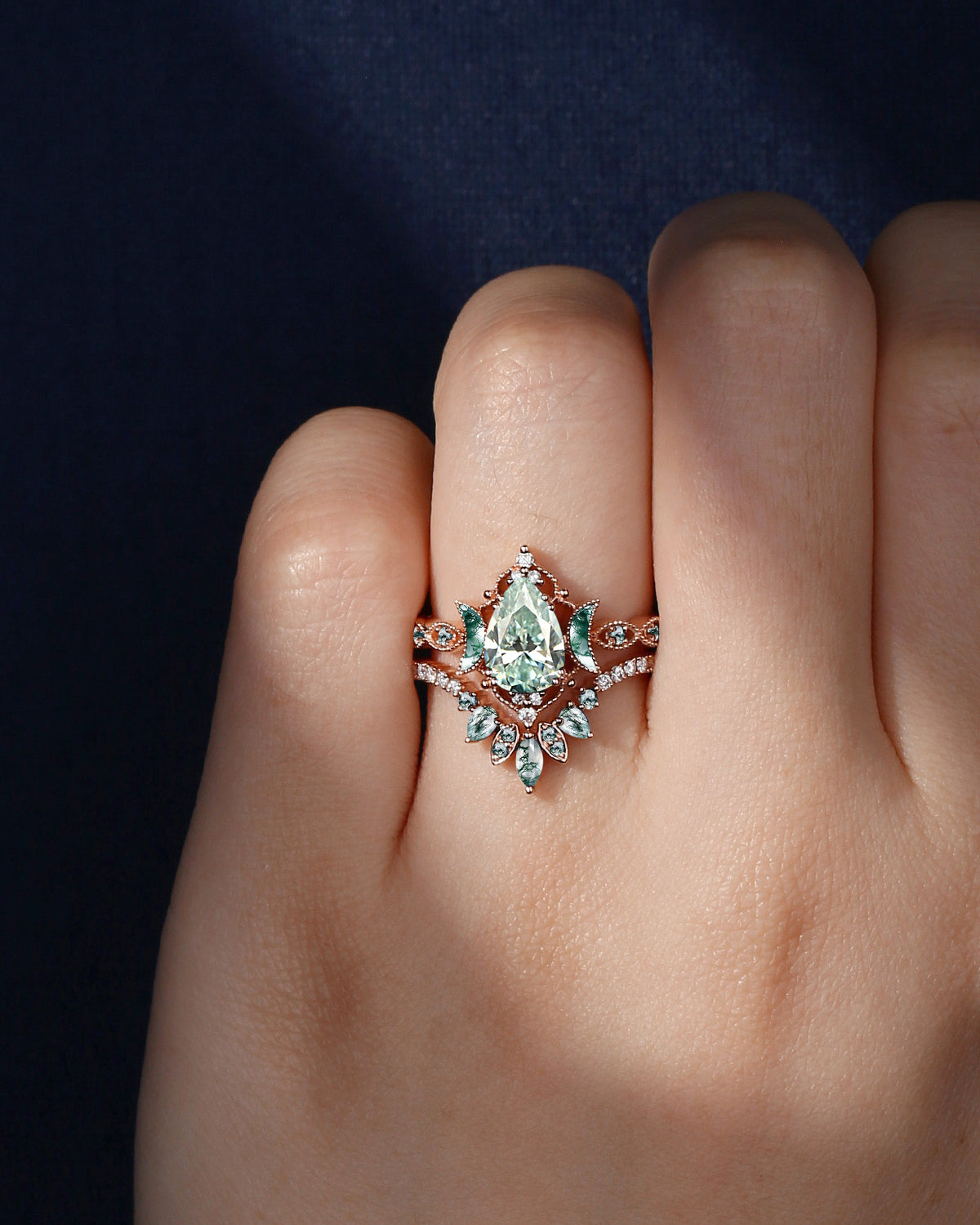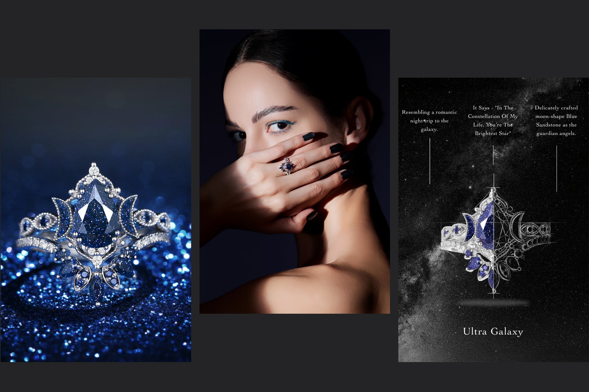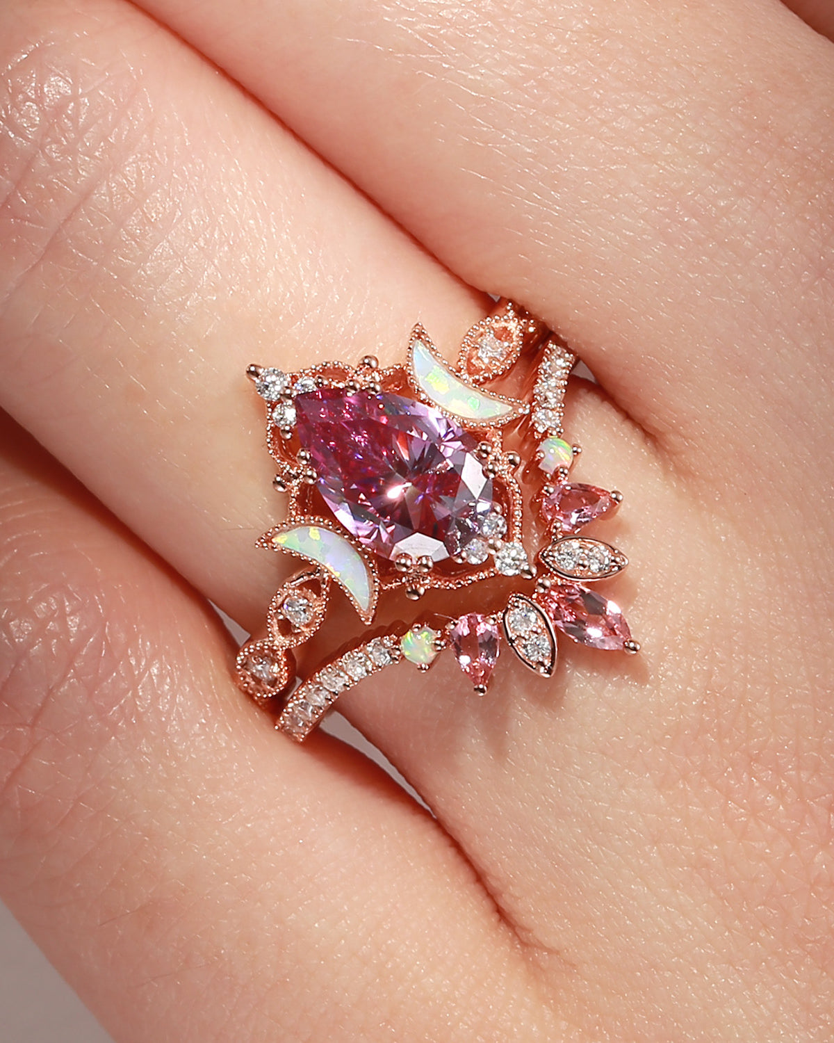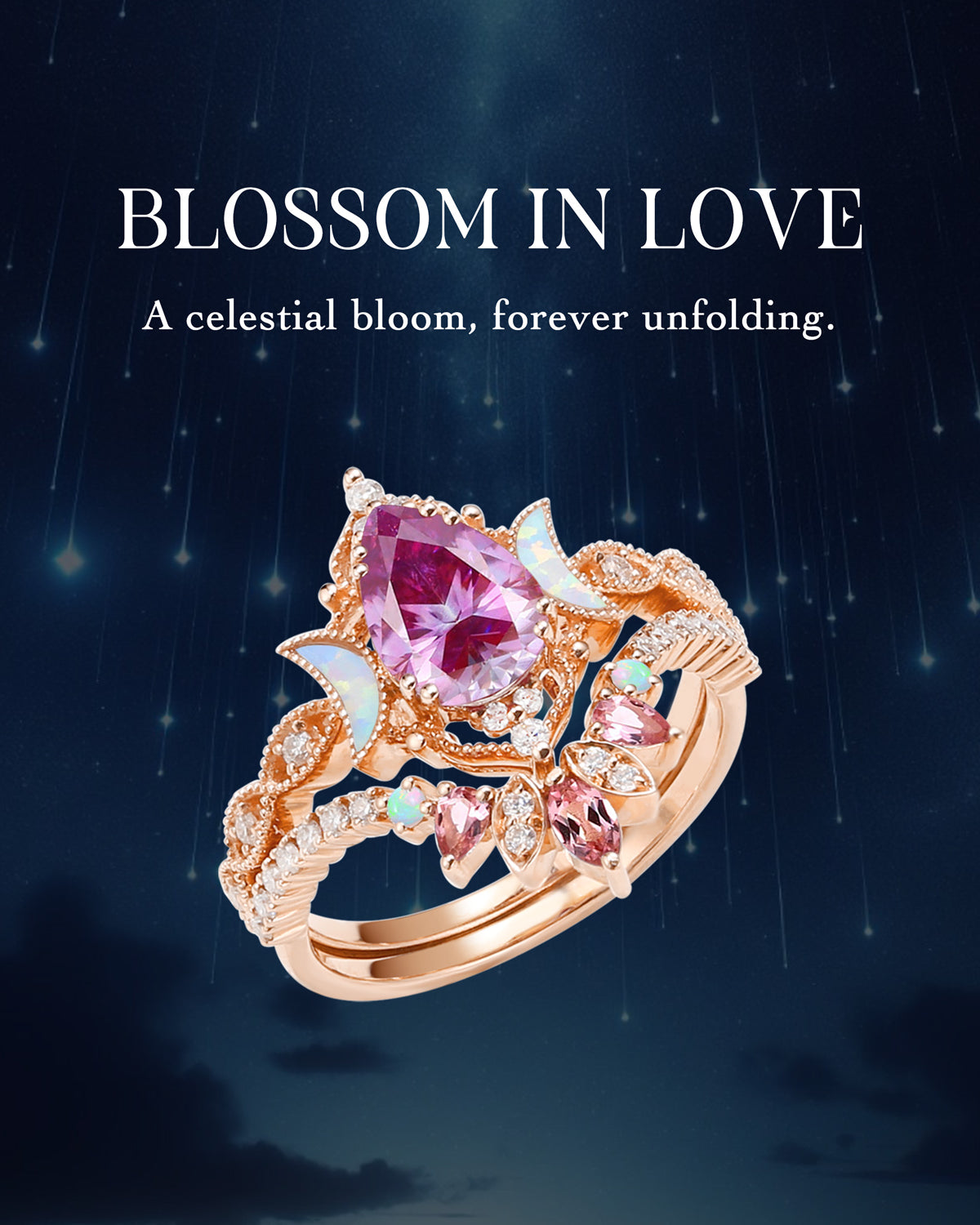 • Design - Two masterfully cut moon shaped gems guarding the center pear, clustered by little sparkly accents, mimicking a galaxy-like setting. A romantic Sci-Fi fiction at its finest. • It Says - In The Constellation Of My Life, You’re The Brightest Star.