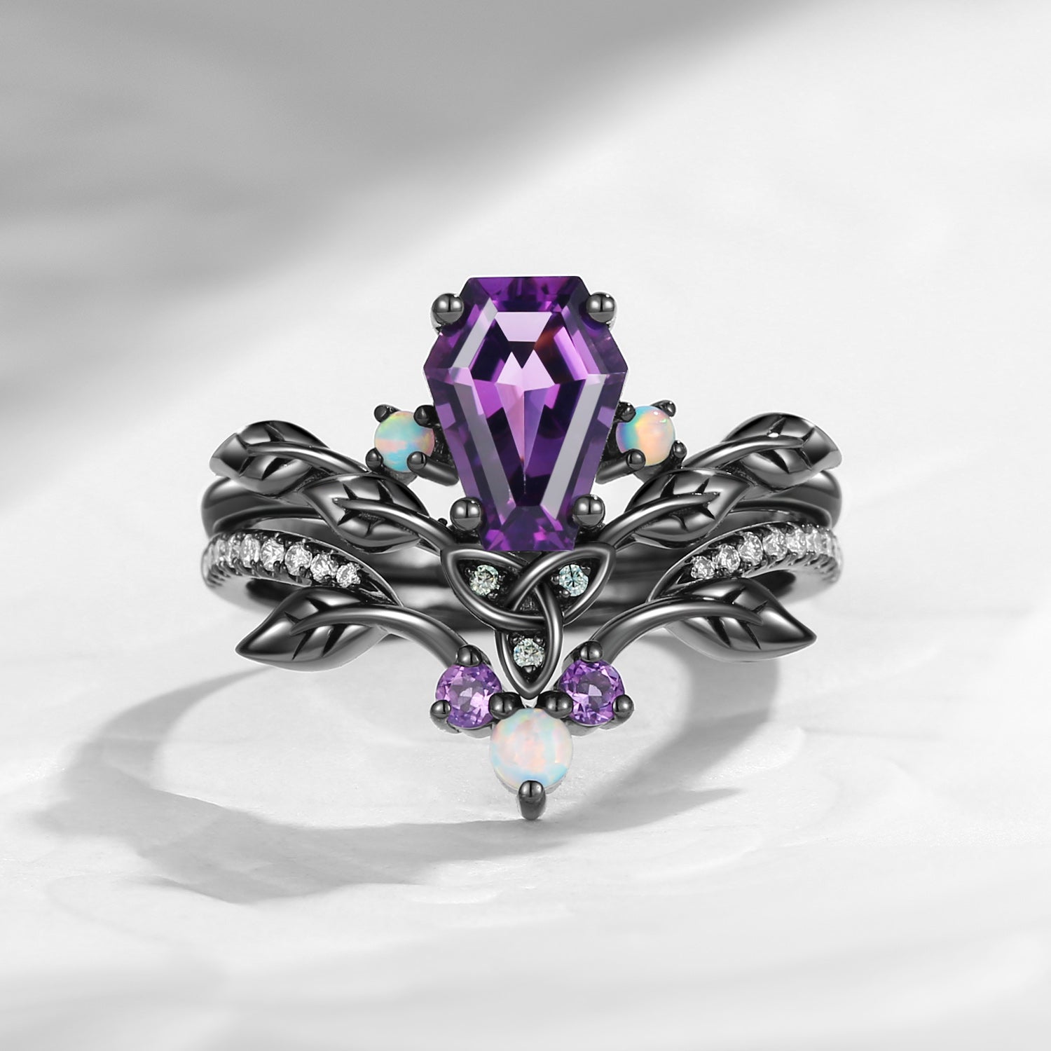 Celtic Calendar | 1.21-2.17 | Coffin Amethyst Nature Inspired Rowan Leafy Celtic Ring Set 2pcs