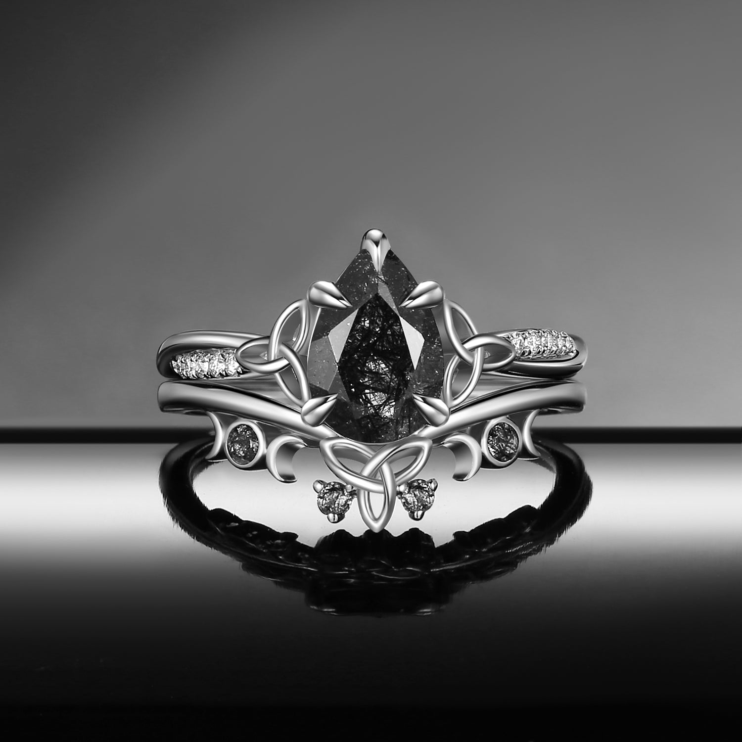 Celtic Moon | Pear Cut Black Rutilated Quartz Celtic Inspired Engagement Ring Set 2pcs