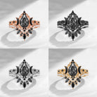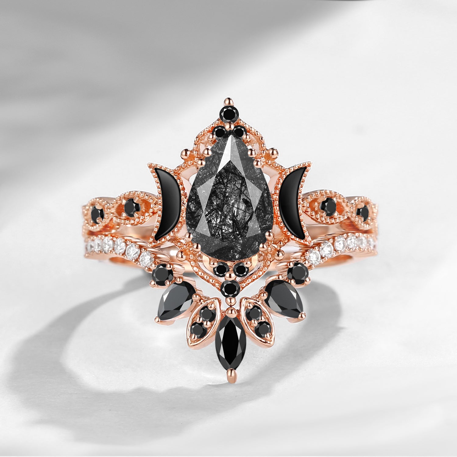 Crescent Moon | Pear Cut Black Rutilated Quartz 'Ultra Galaxy' Engagement Ring Set 2pcs