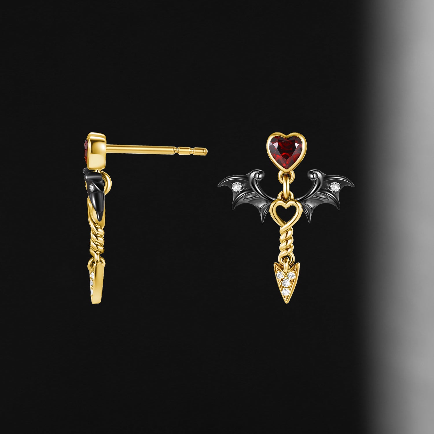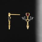 Gothic Bat Inspired Heart Shaped Garnet Earrings - 'Dark Arrow of Love'