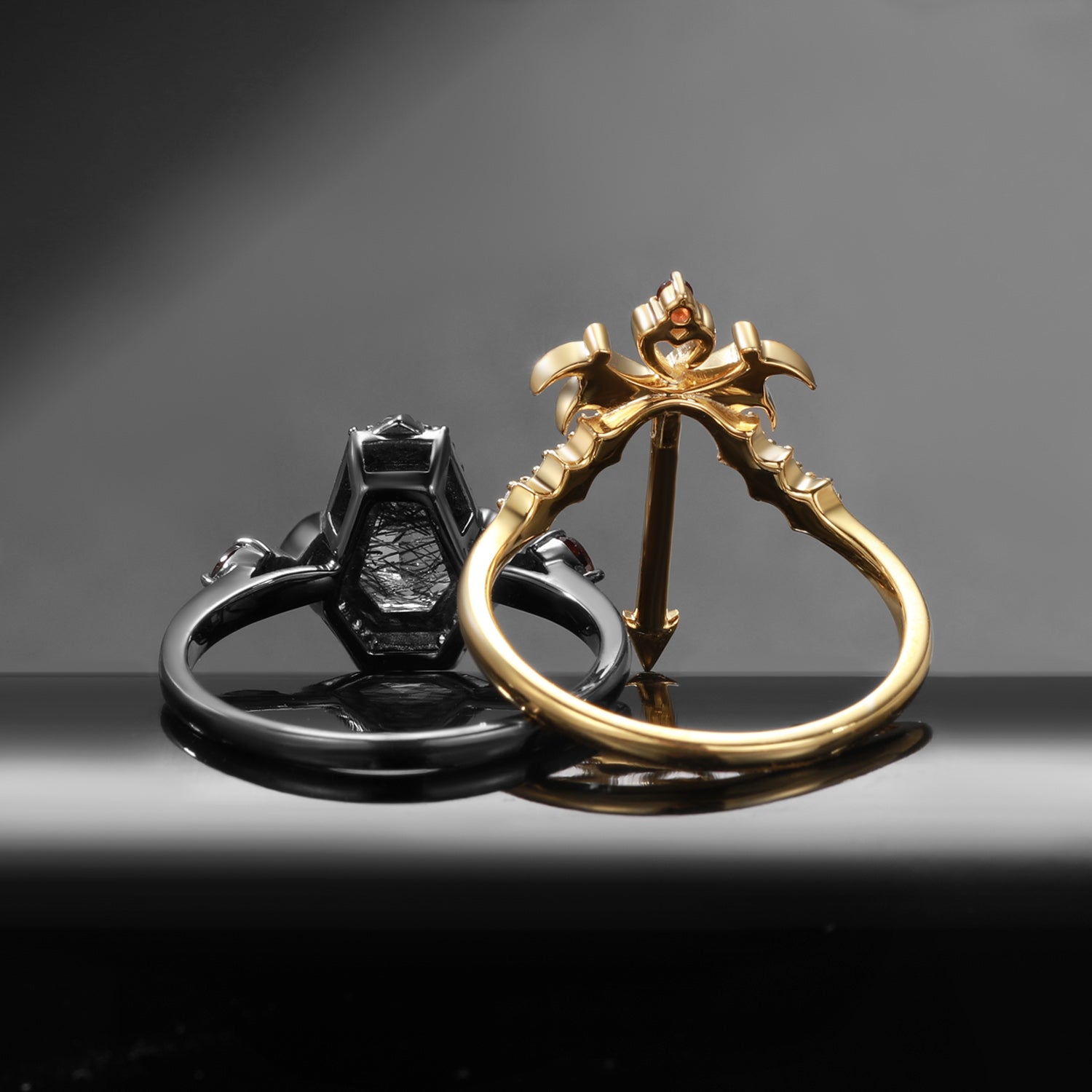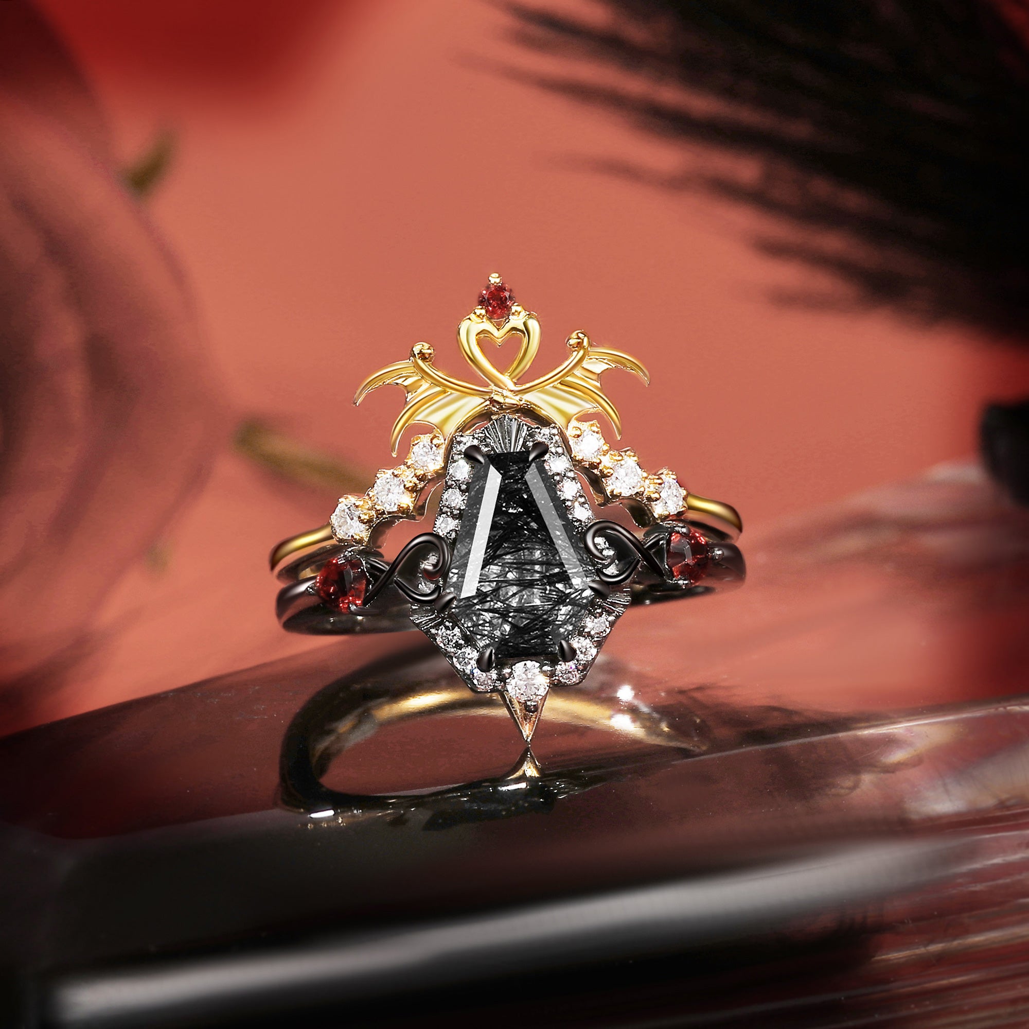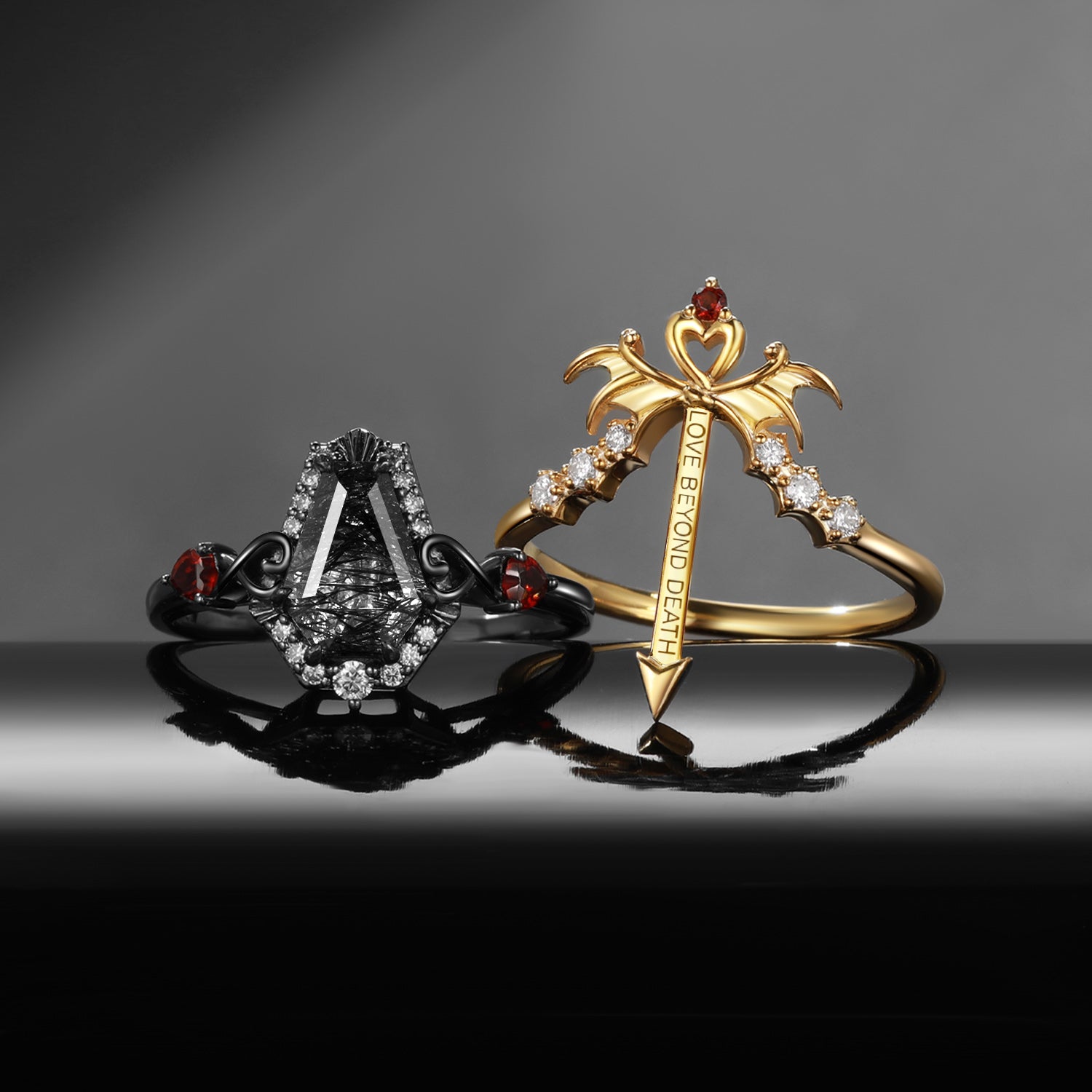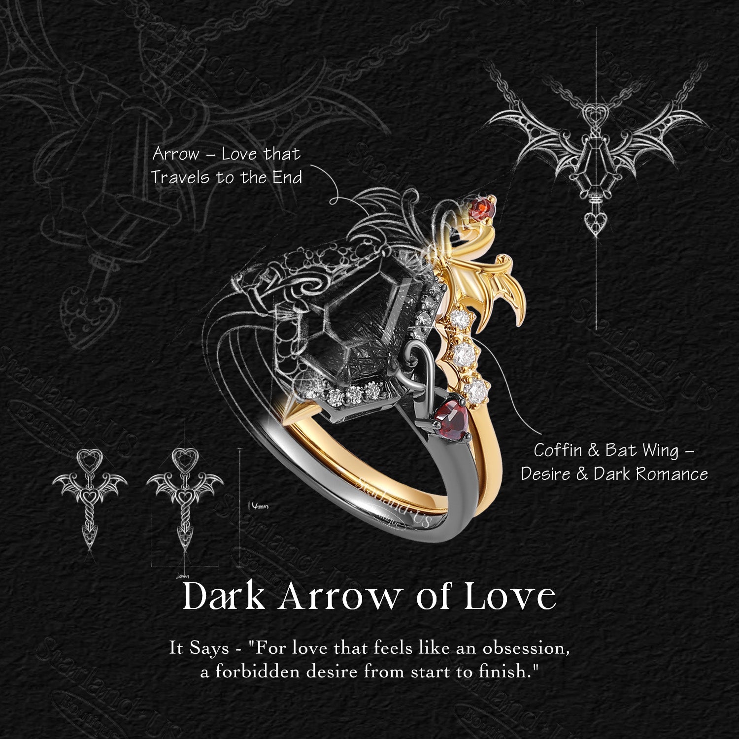 Gothic Bat Wing Inspired Coffin Black Rutilated Quartz Two-Tone Bridal Set 2pcs "Dark Arrow of Love" Valentine's Day Gift