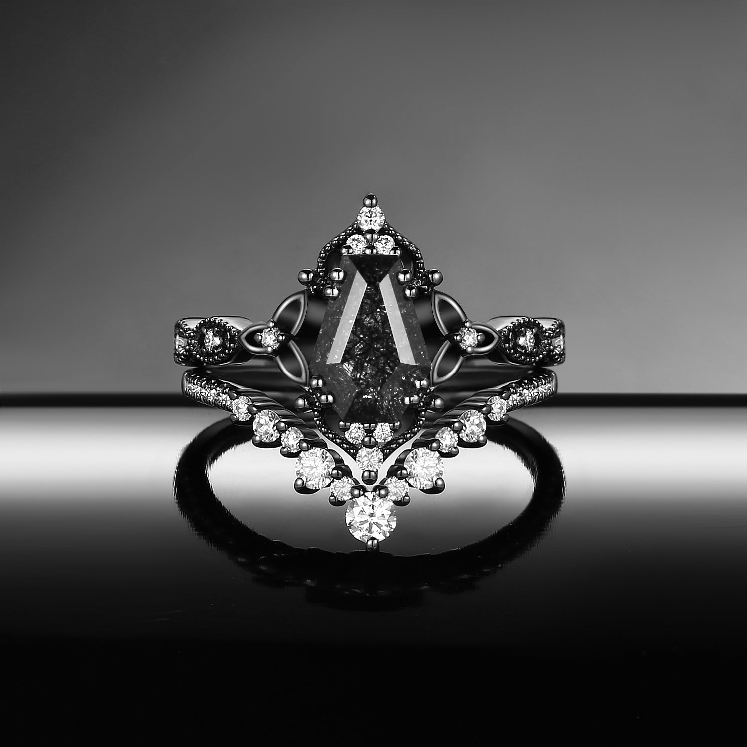 Vintage Inspired Coffin Cut Black Rutilated Quartz Celtic Engagement Ring Set 2pcs