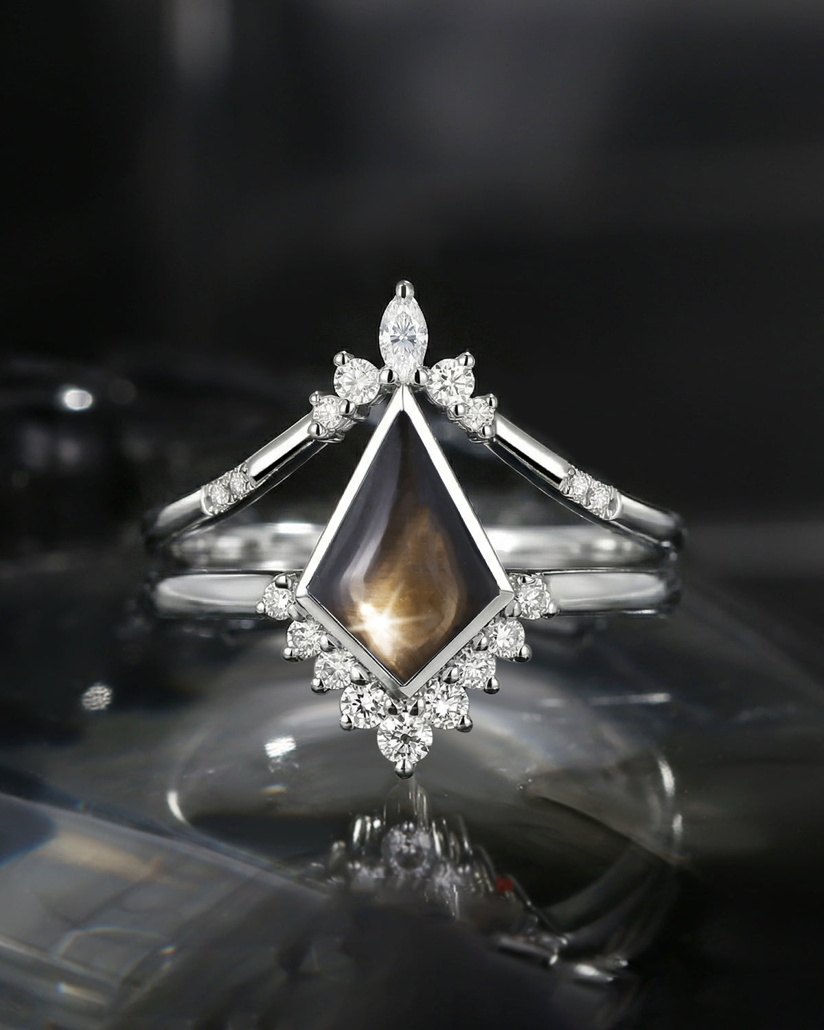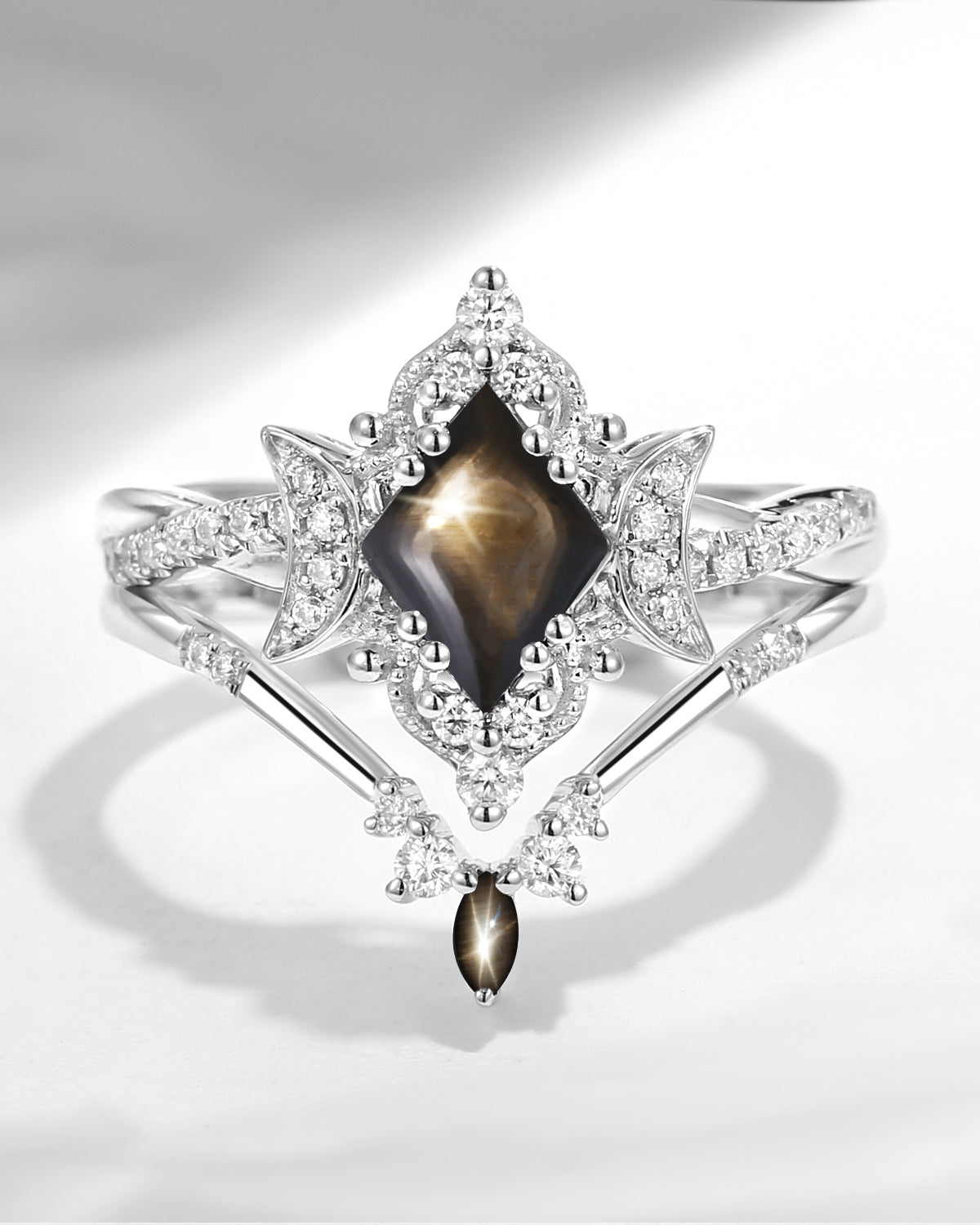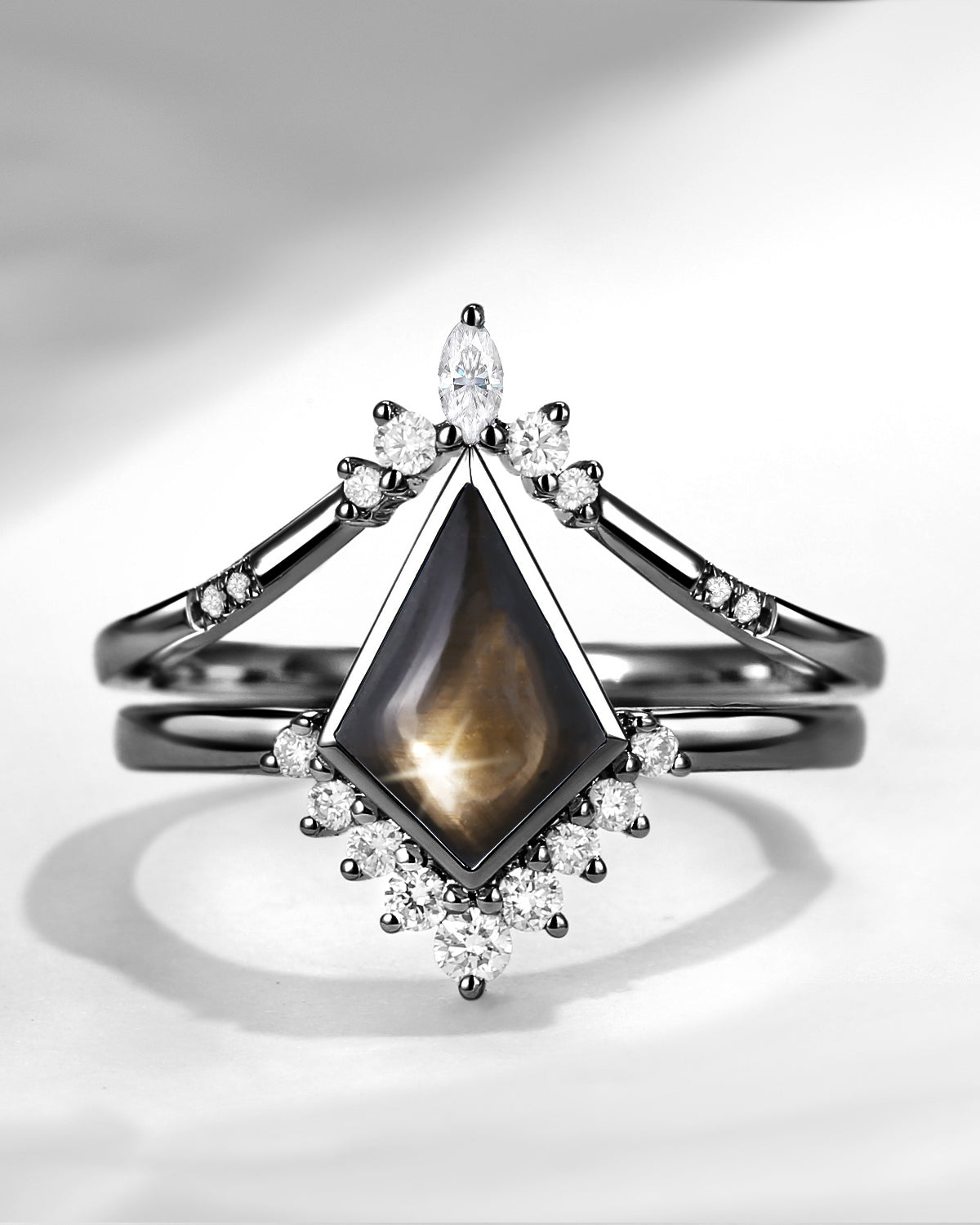 Kite Cut Natural Black Star Sapphire Engagement Ring Set 2pcs - Electra