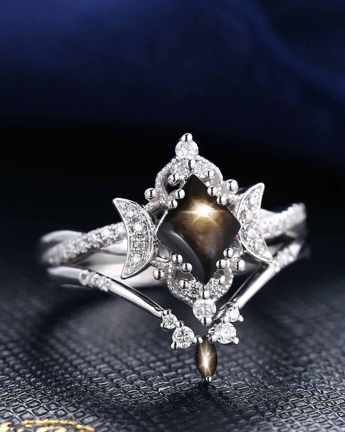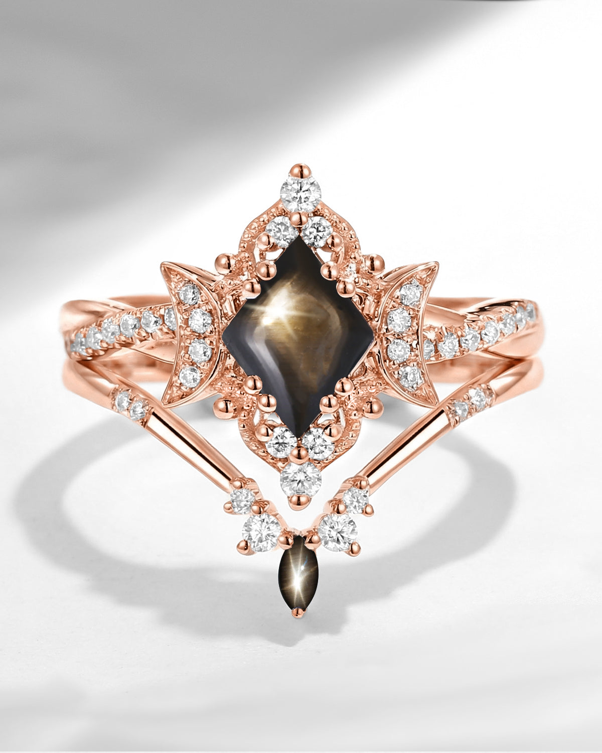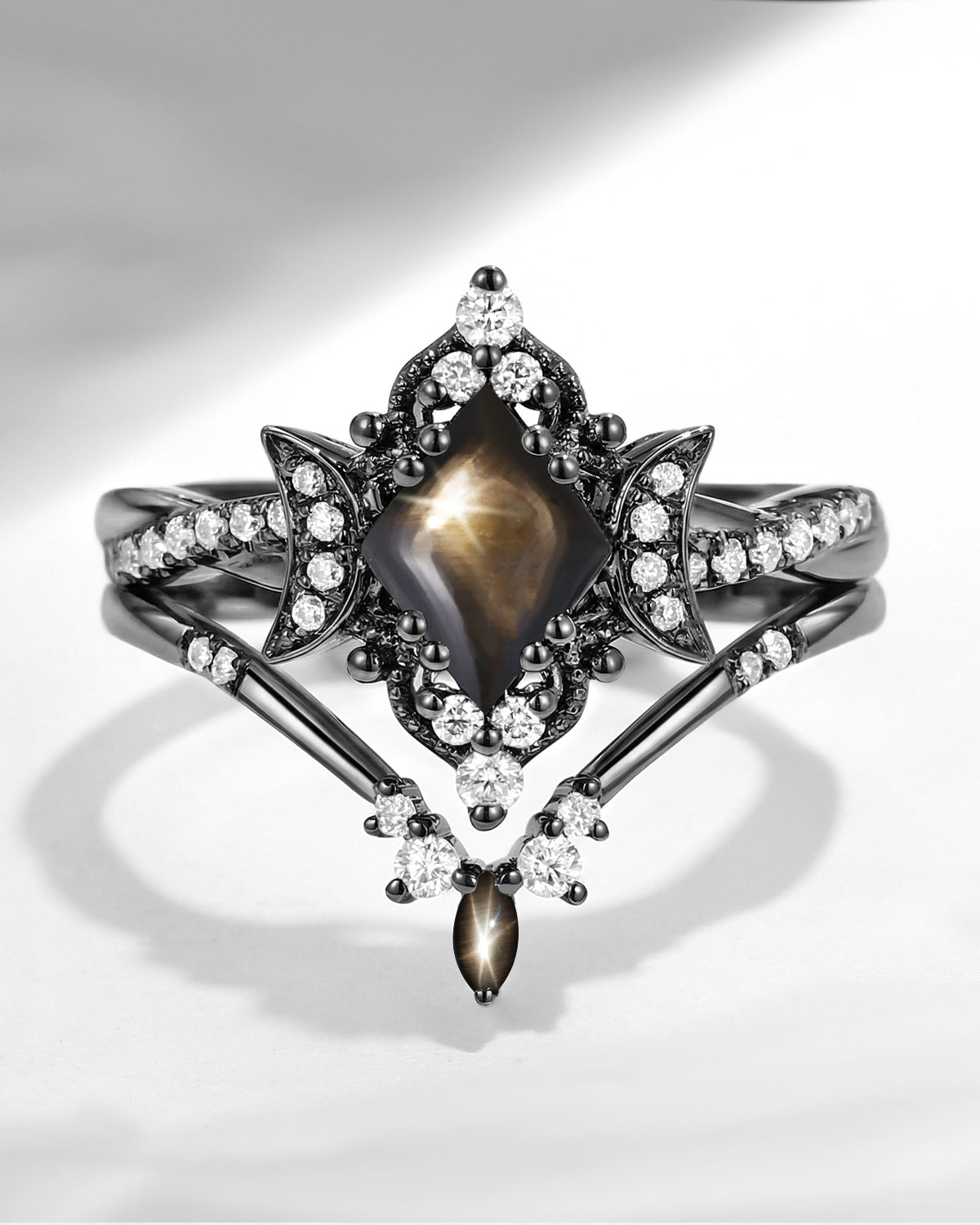 Kite Cut Natural Black Star Sapphire Engagement Ring Set 2pcs - Electra