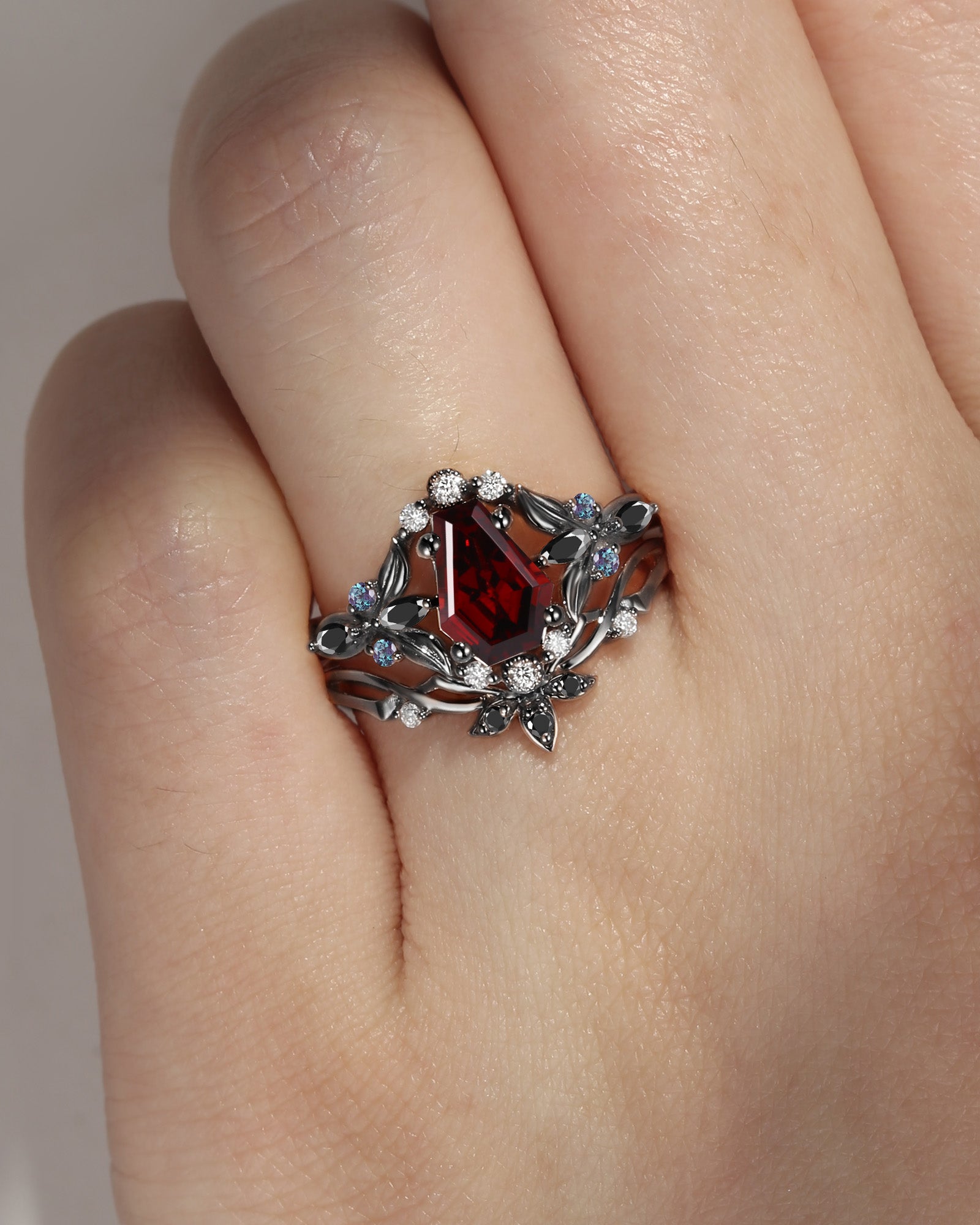Gothic Style Coffin Cut Garnet Nature Inspired Engagement Ring Set 2pcs