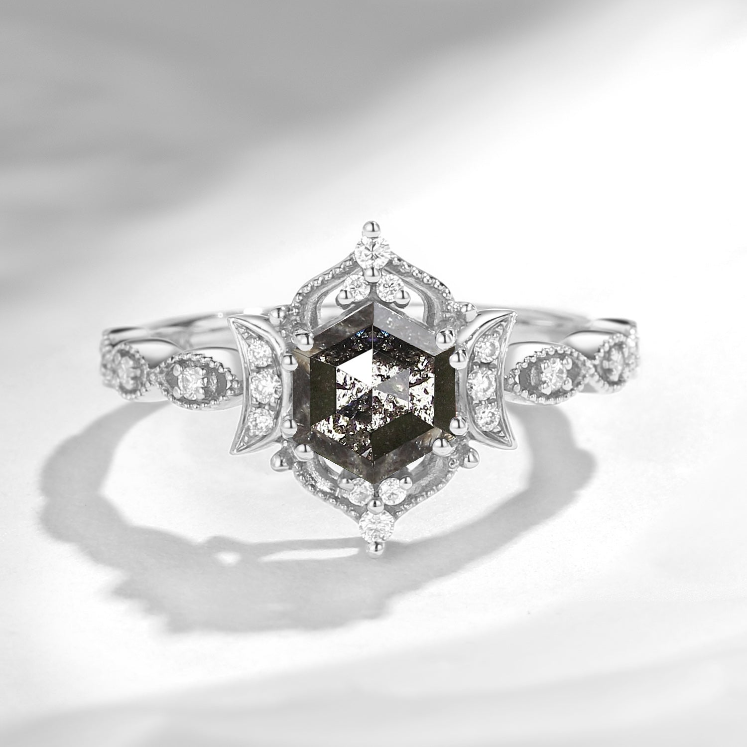 Crescent Moon | Vintage Inspired Hexagon Salt & Pepper Diamond Ring