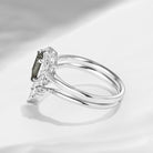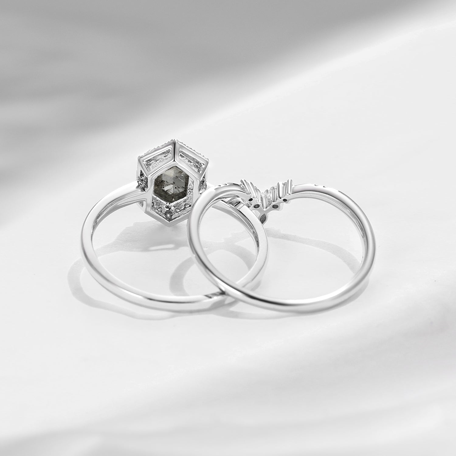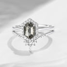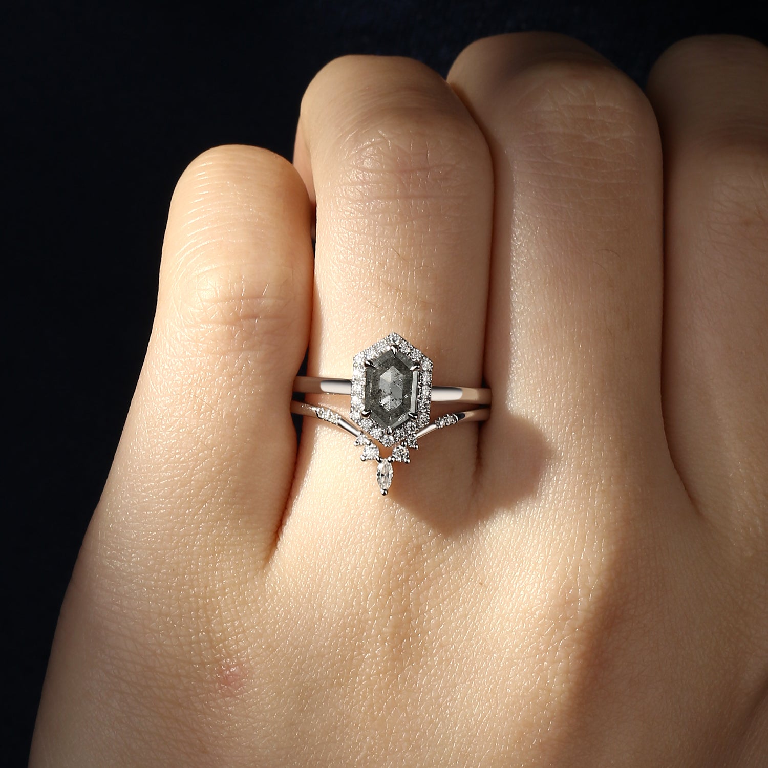 Long Hexagon Salt and Pepper Diamond Engagement Ring Set 2pcs Solitaire Cluster Ring