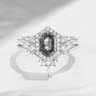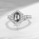 Long Hexagon Salt and Pepper Diamond Halo Engagement Ring Set 2pcs