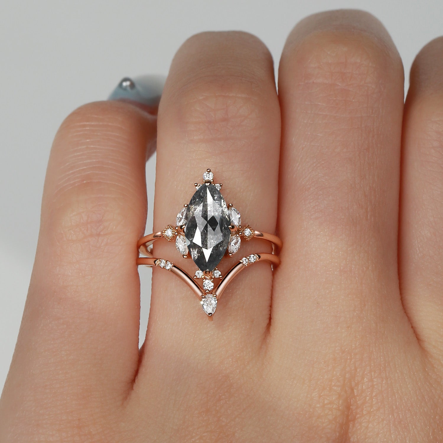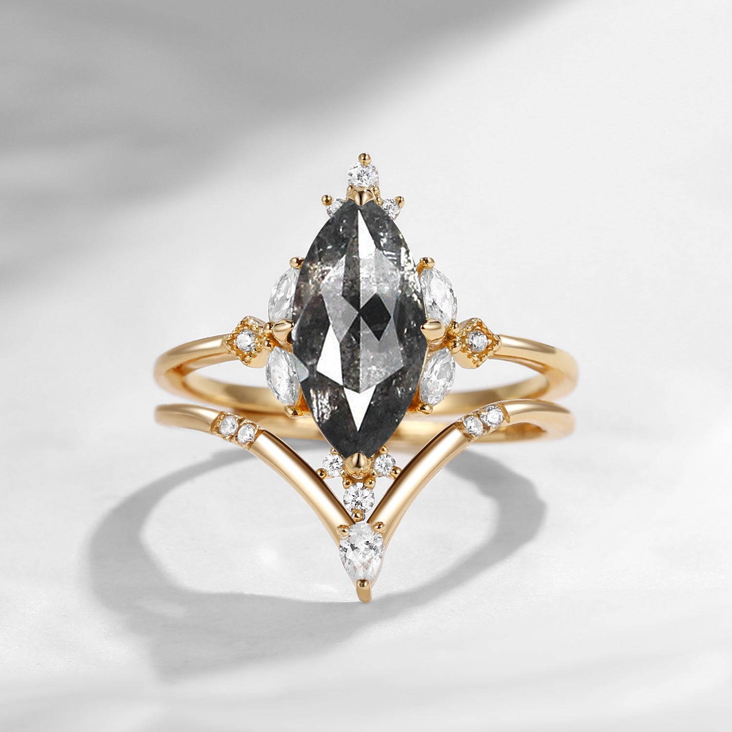 Marquise Cut Natural Salt And Pepper Diamond Solitaire Ring Set 2pcs Vintage Bridal Set Marquise 2pcs