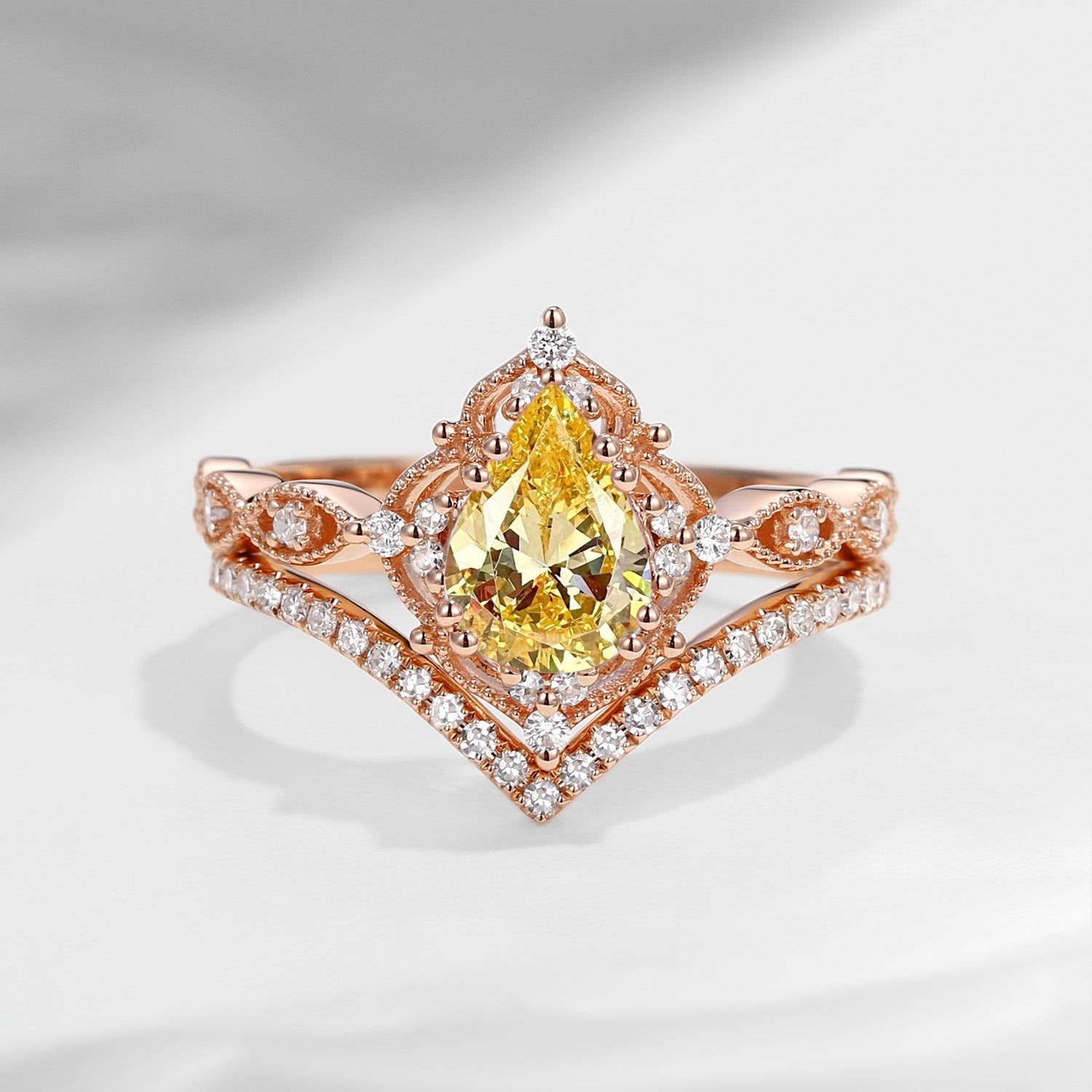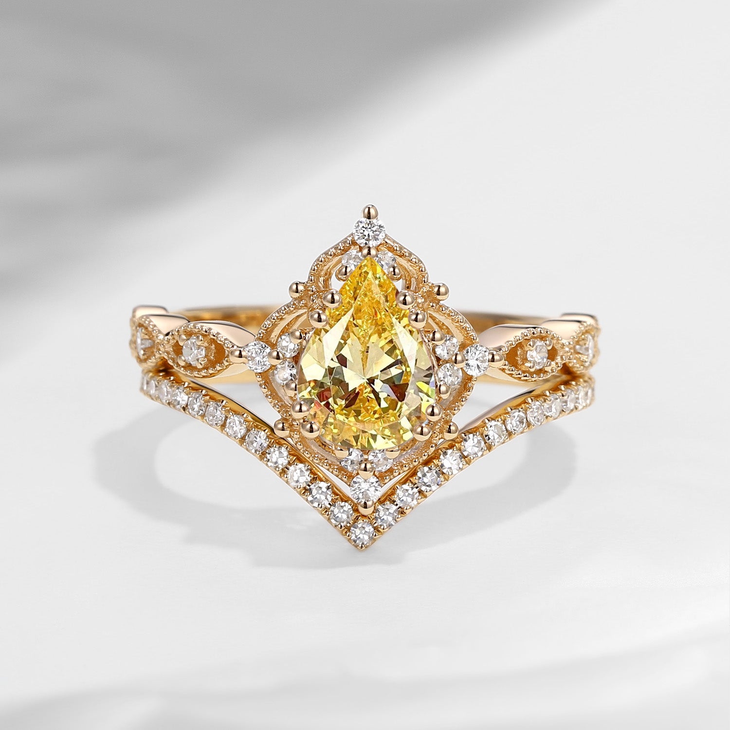 Pear Shaped Yellow Lab Diamond Antique Stacking Engagement Ring 2pcs - Evelyn