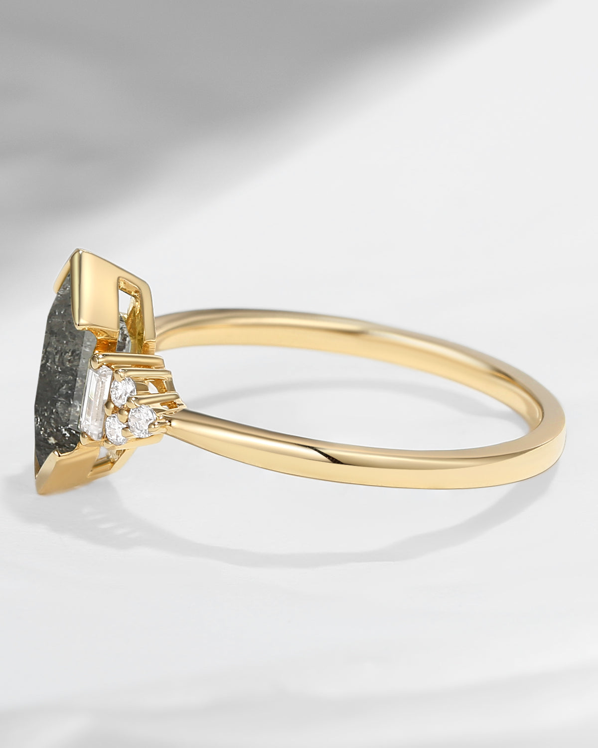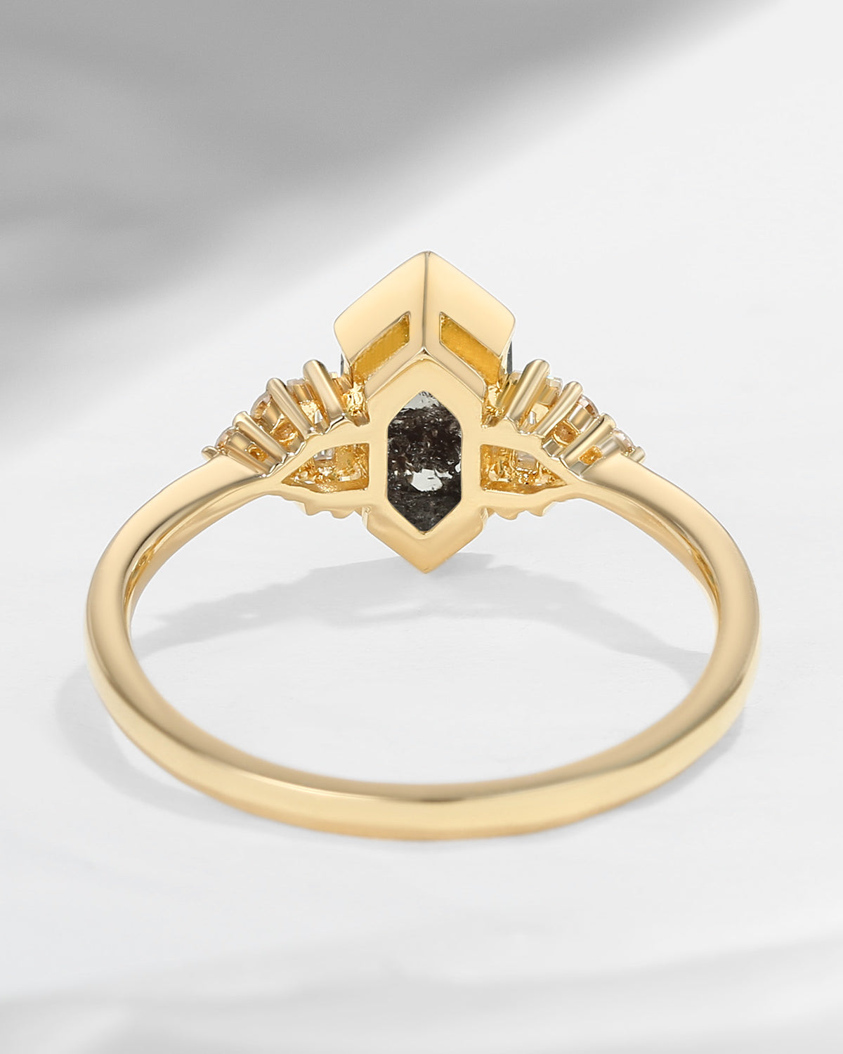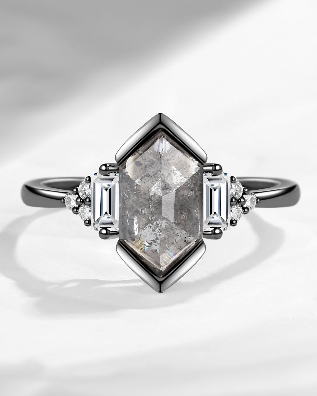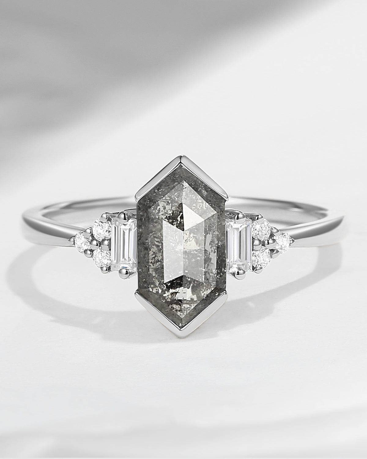 Long Hexagon Natural Salt And Pepper Diamond Vintage Cluster Engagement Ring