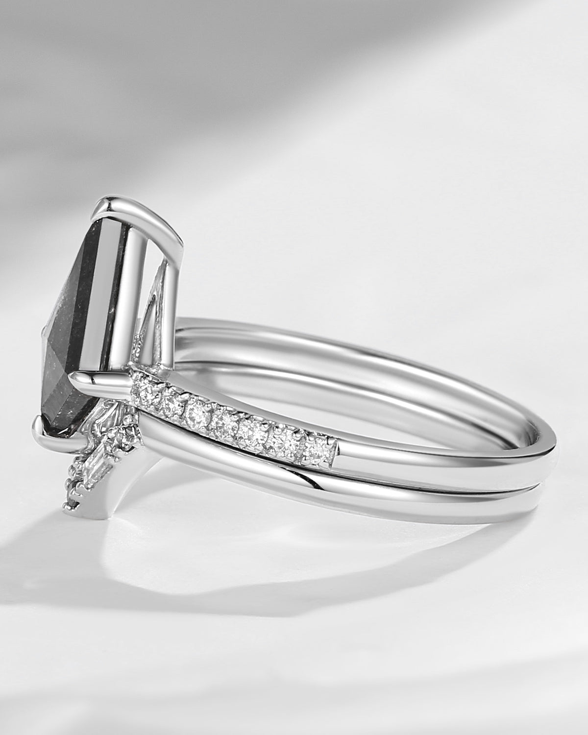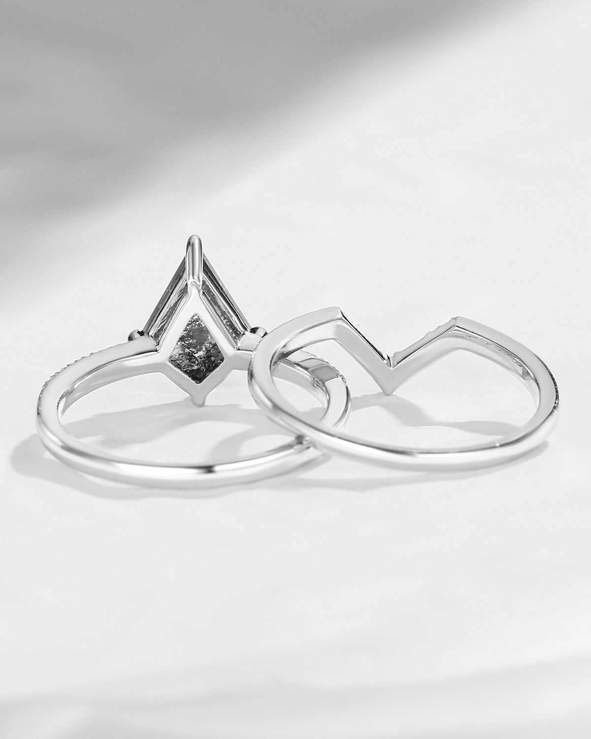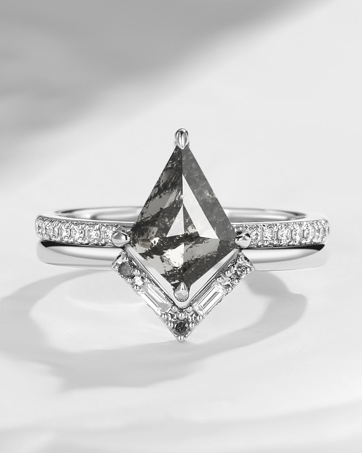 Kite Cut Natural Salt And Pepper Diamond Art Deco Engagement Ring Set 2pcs