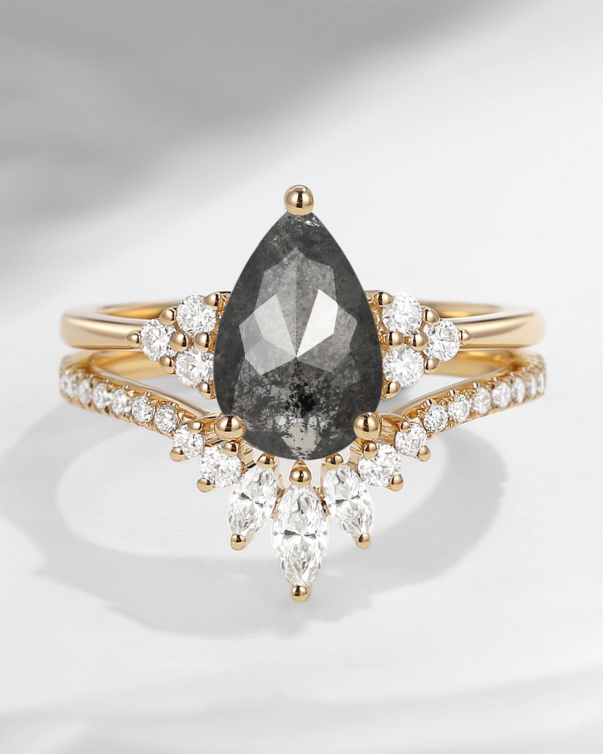Pear Cut Salt and Pepper Diamond Cluster Engagement Ring Set 2pcs - Vivian