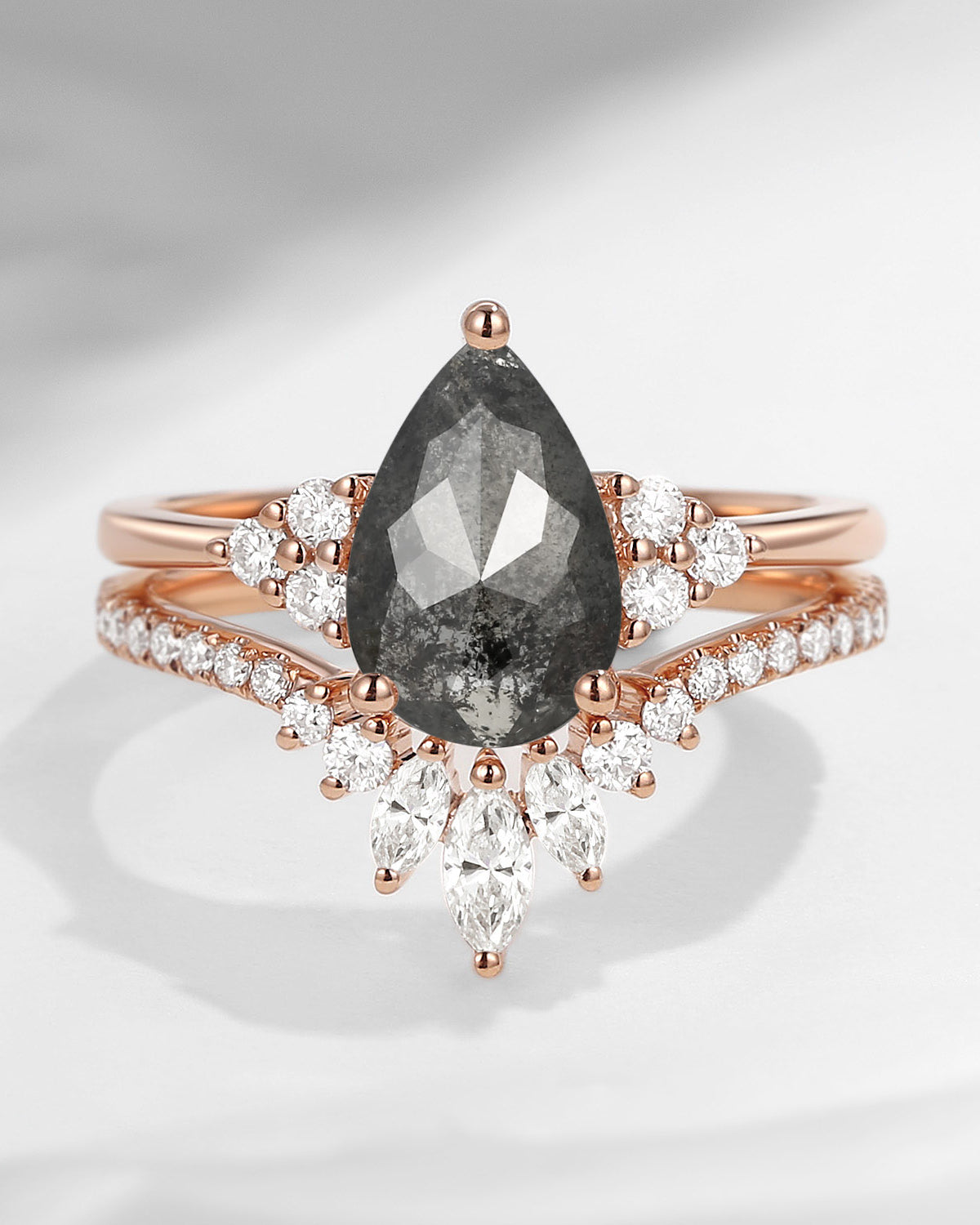 Crescent Moon | Pear Cut Salt And Pepper Diamond Galaxy Engagement Ring Set 2PCS