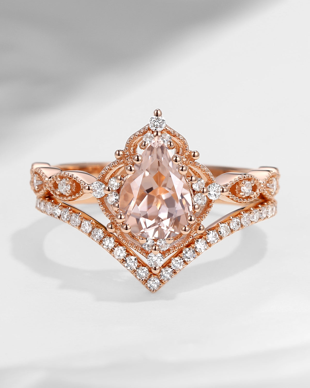 1.5ct Pear Shaped Morganite Engagement Ring Set 2pcs - Evelyn
