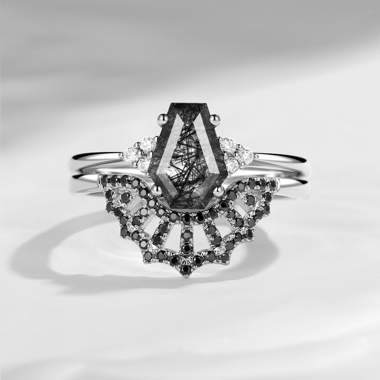 Cluster Coffin Black Rutilated Quartz Spider Web Engagement Ring Set 2pcs