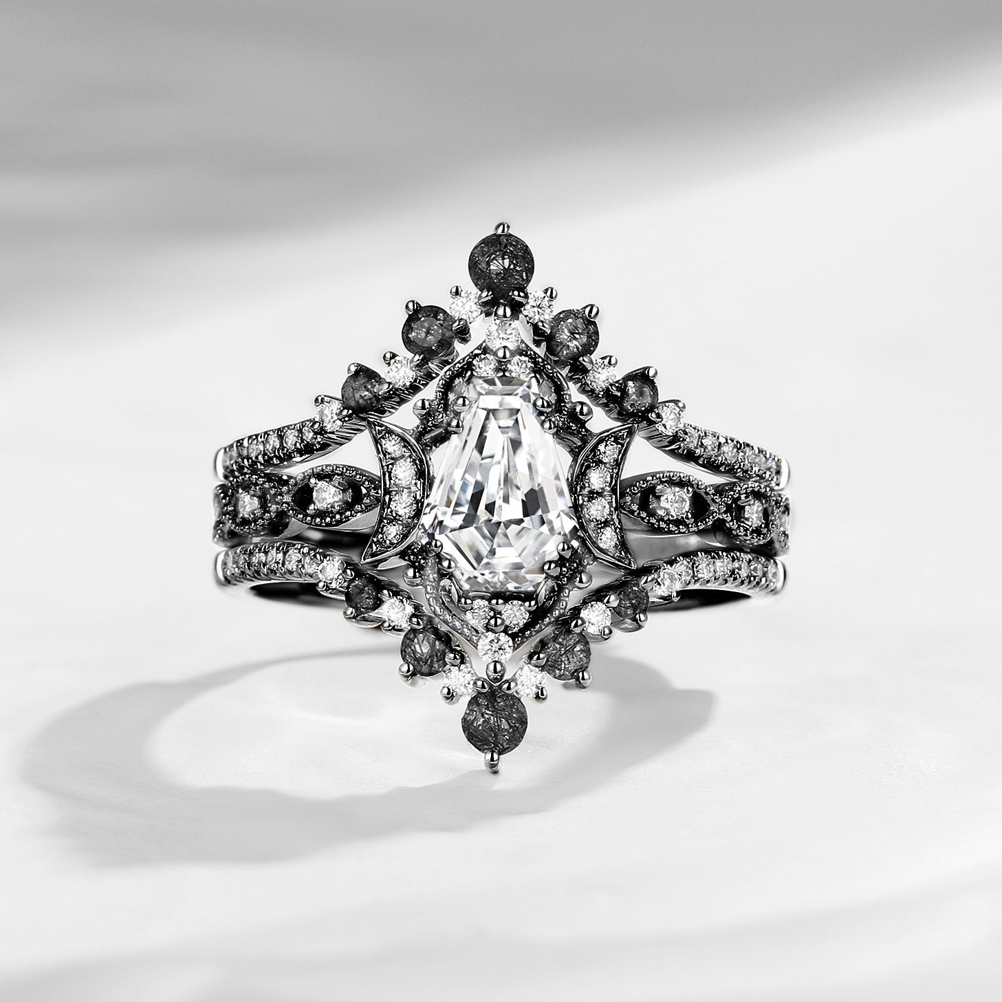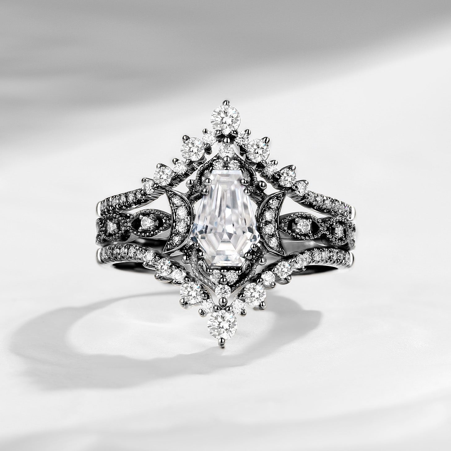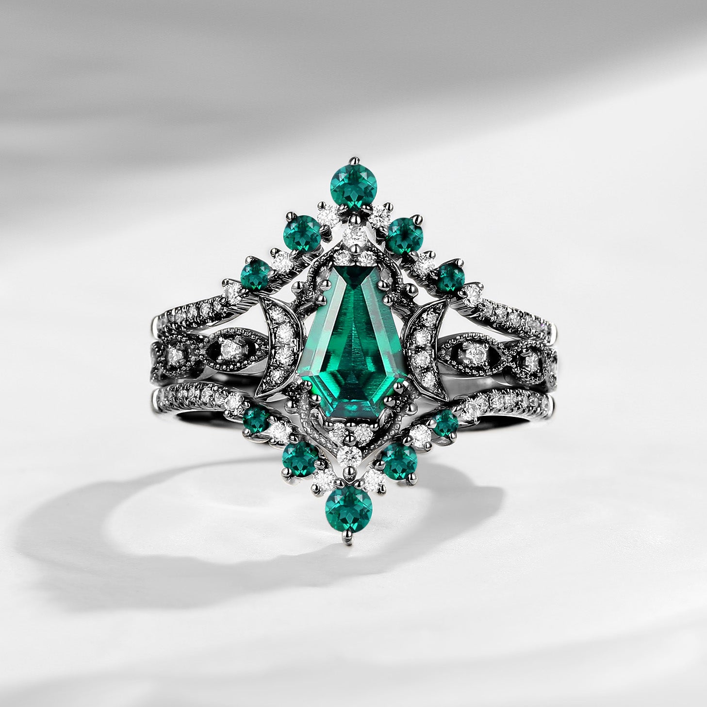 Coffin Lab Emerald Crescent Engagement Ring 3pcs Moon Bridal Ring Vintage Engagement Ring Art Deco Vintage 'Black Statement' Ring Set 3pcs