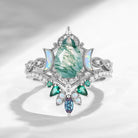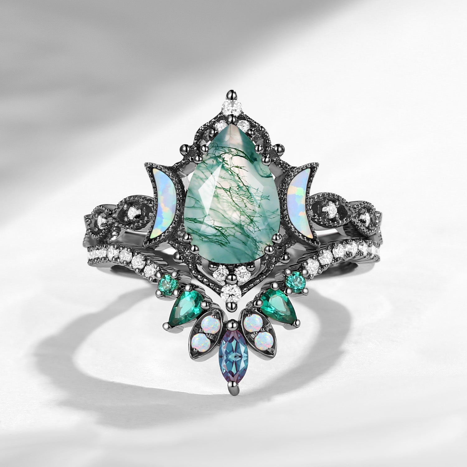 Crescent Moon | Pear Cut Moss Agate 'Ultra Galaxy' Lab Opal Engagement Ring Set 2pcs