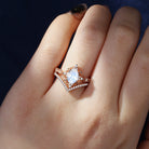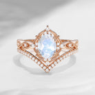 Moonstone Bridal Set Rose Gold Cluster Rings Oval Engagement Ring V Shaped Chevron Band Women Petal Ring Vine Milgrain Leafy Band 2pcs Vintage Inspired