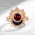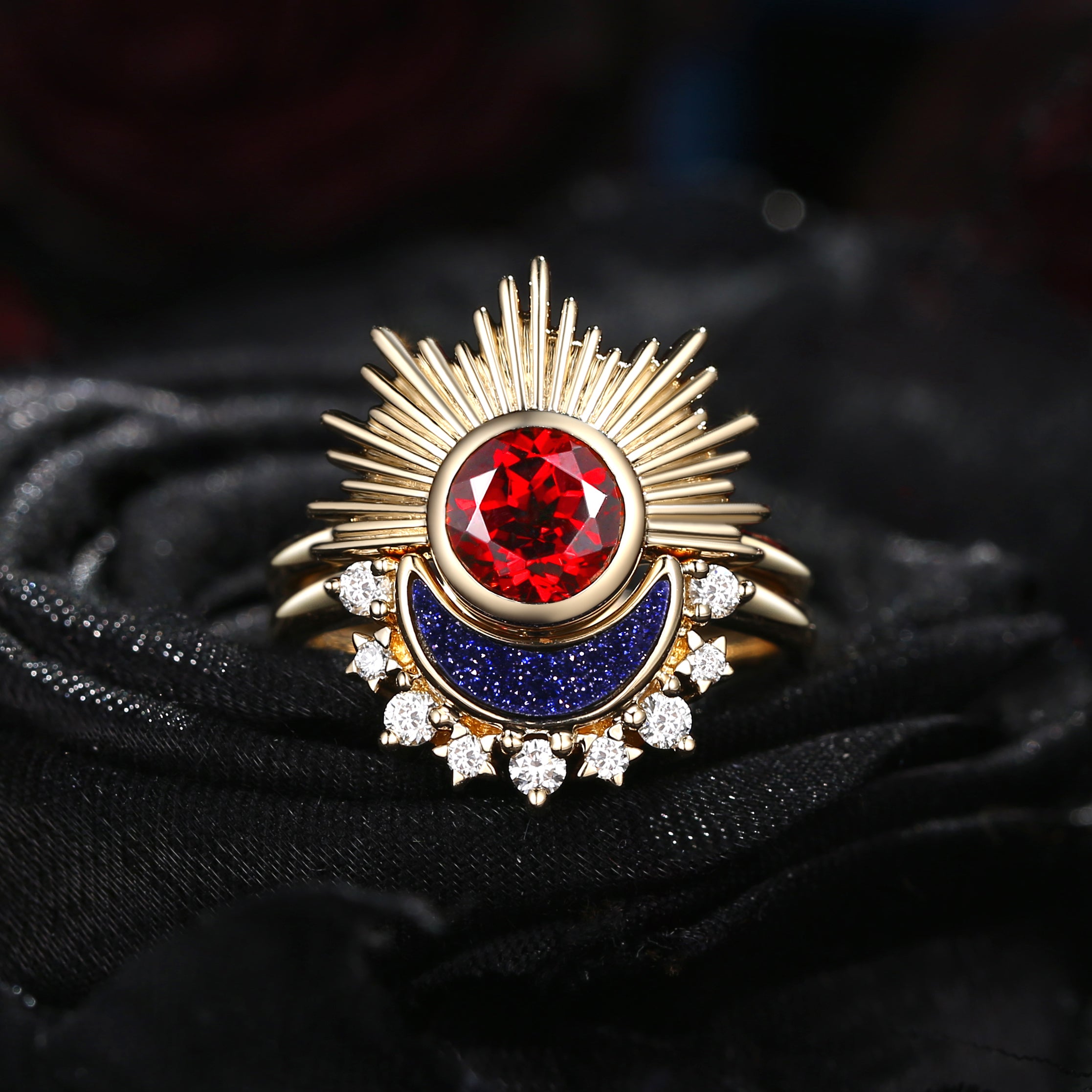 Round Garnet Solitaire Retro Sun & Moon Engagement Ring Set 2pcs