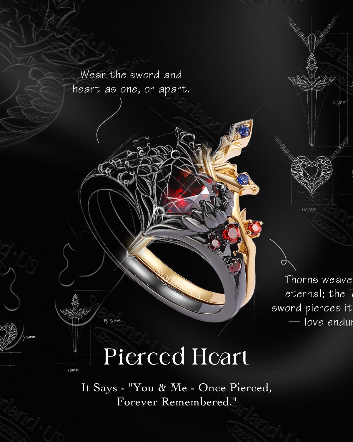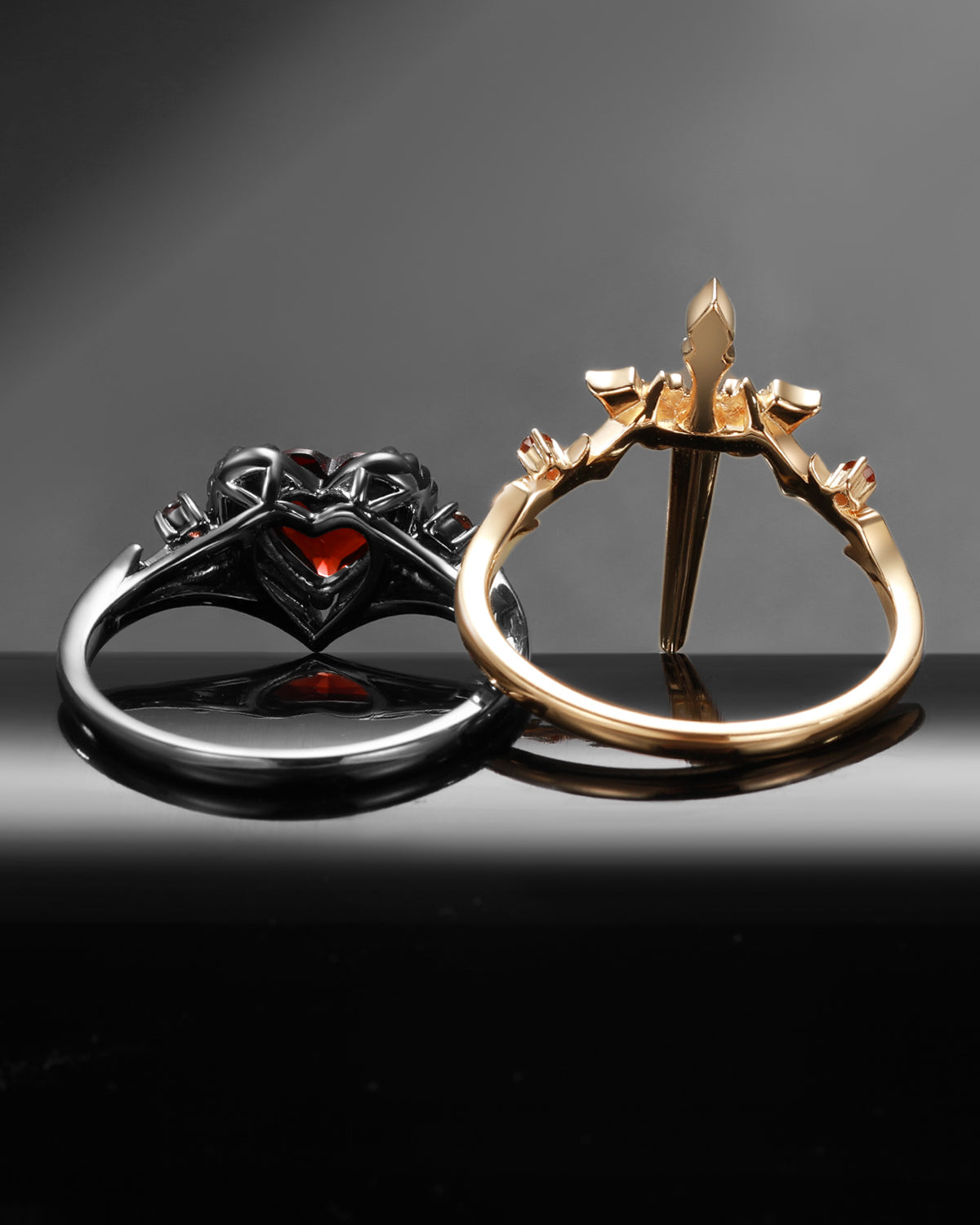 Gothic Inspired 'Thorns & Roses' Coffin Cut Garnet Couple Rings 2pcs