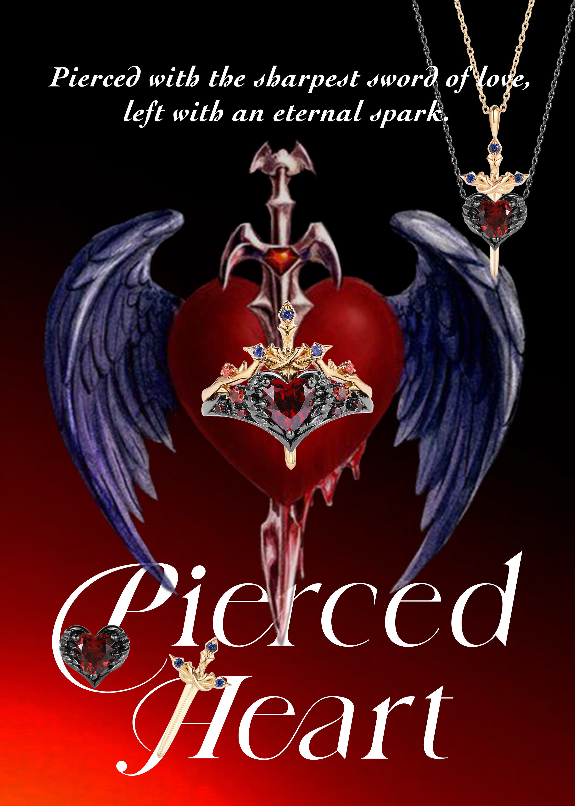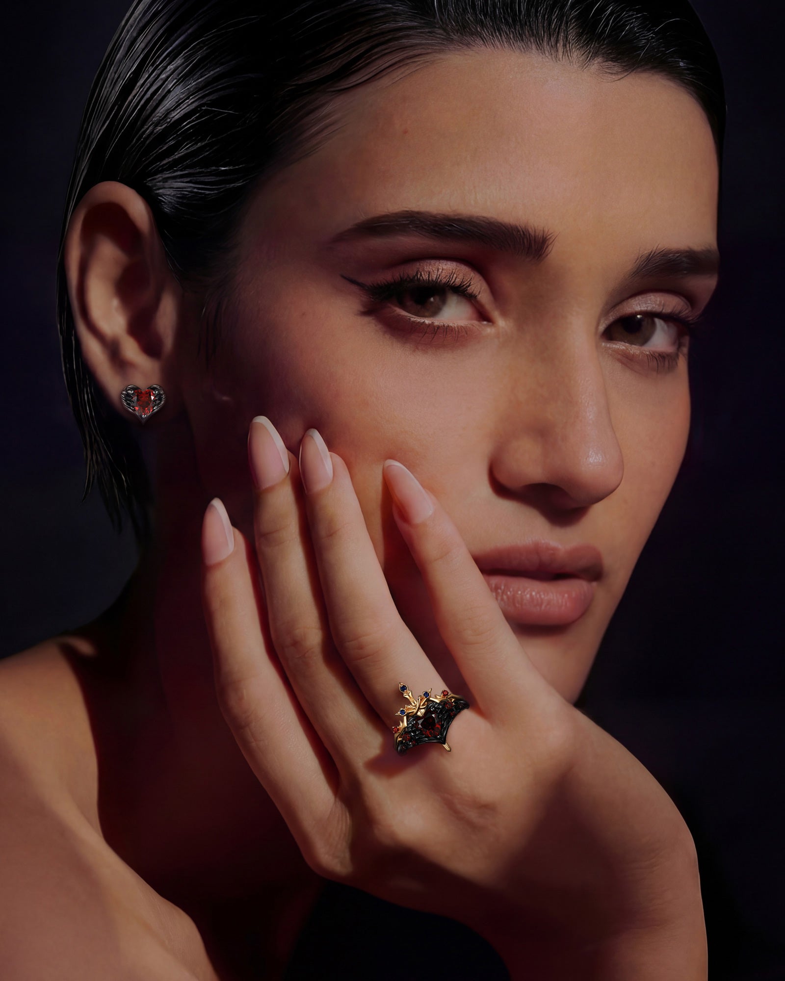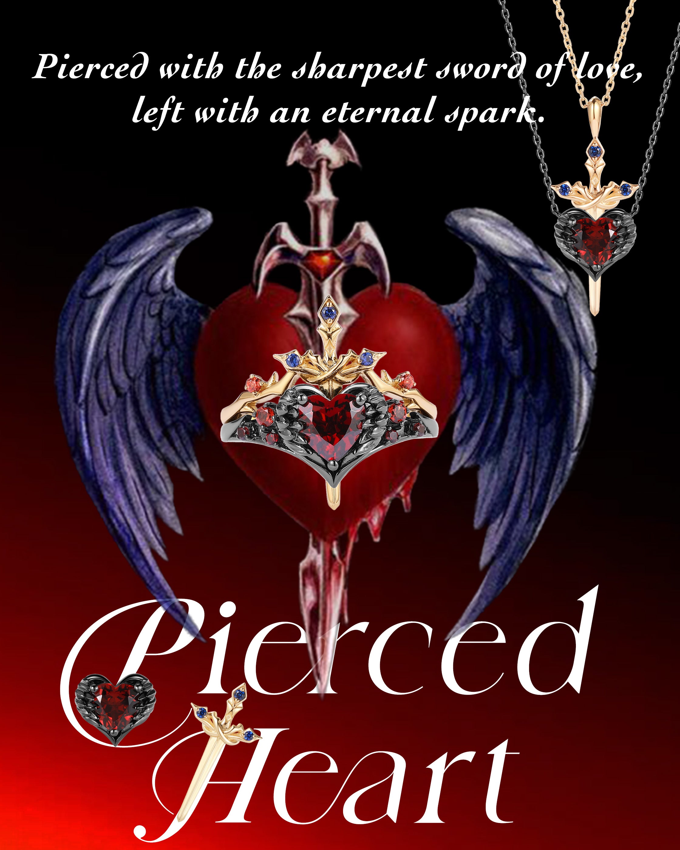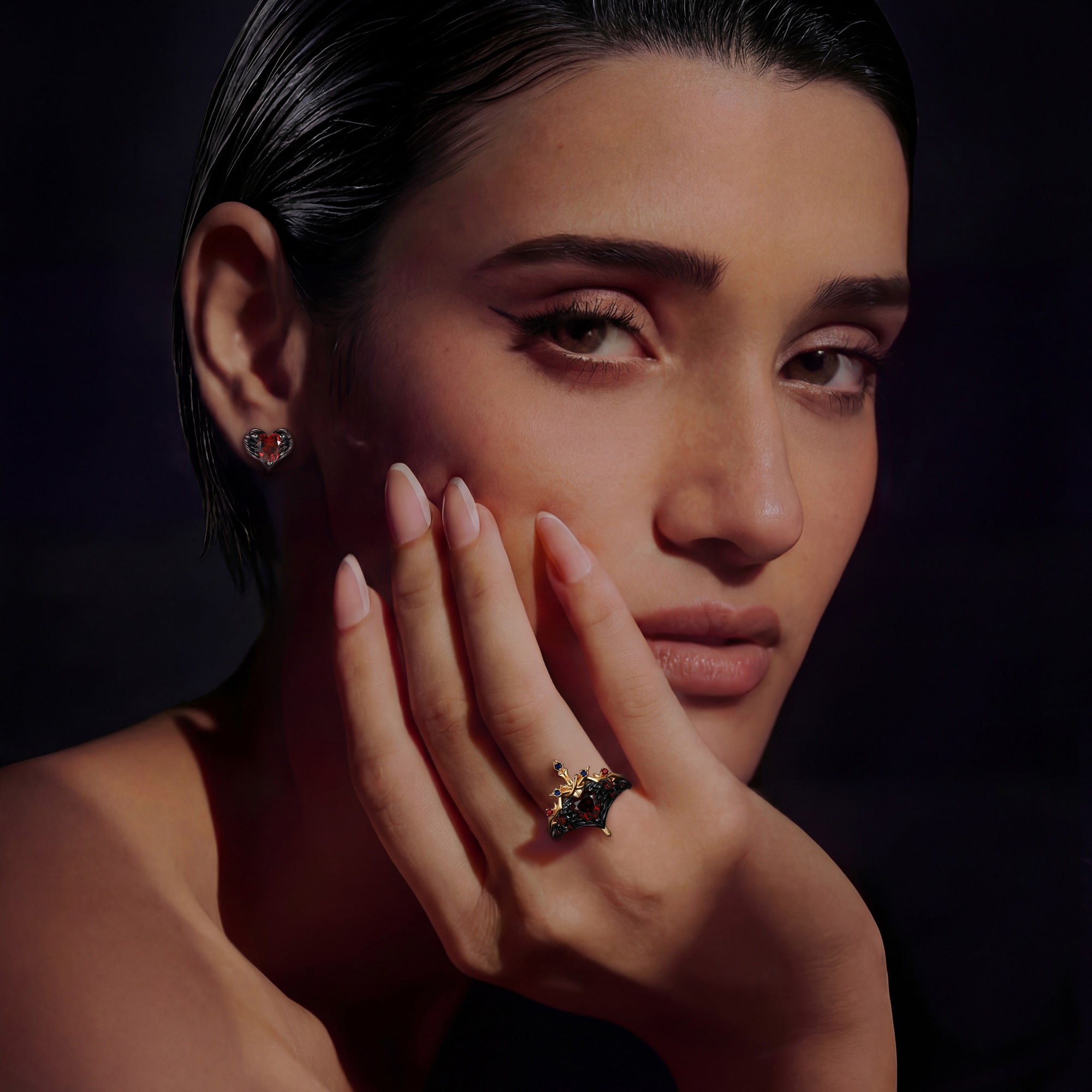 Heart Shaped Lab Ruby Vintage Black Gold Bridal Set 2pcs - Bat Ring