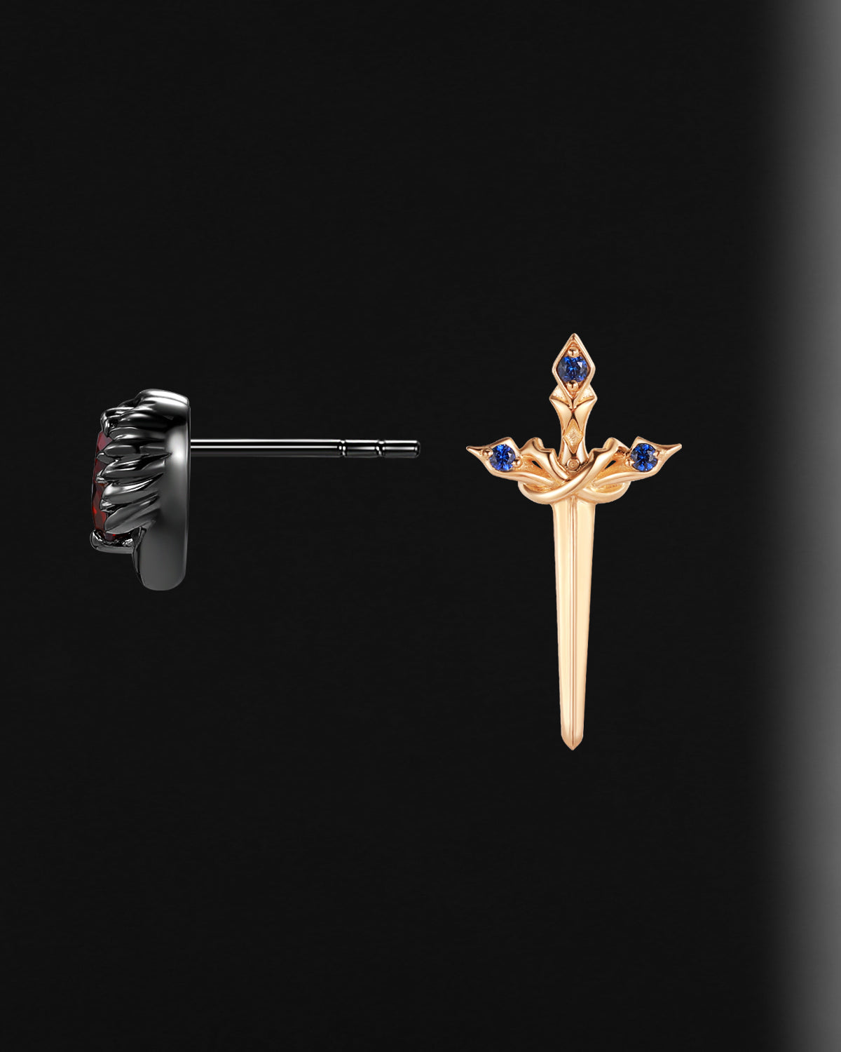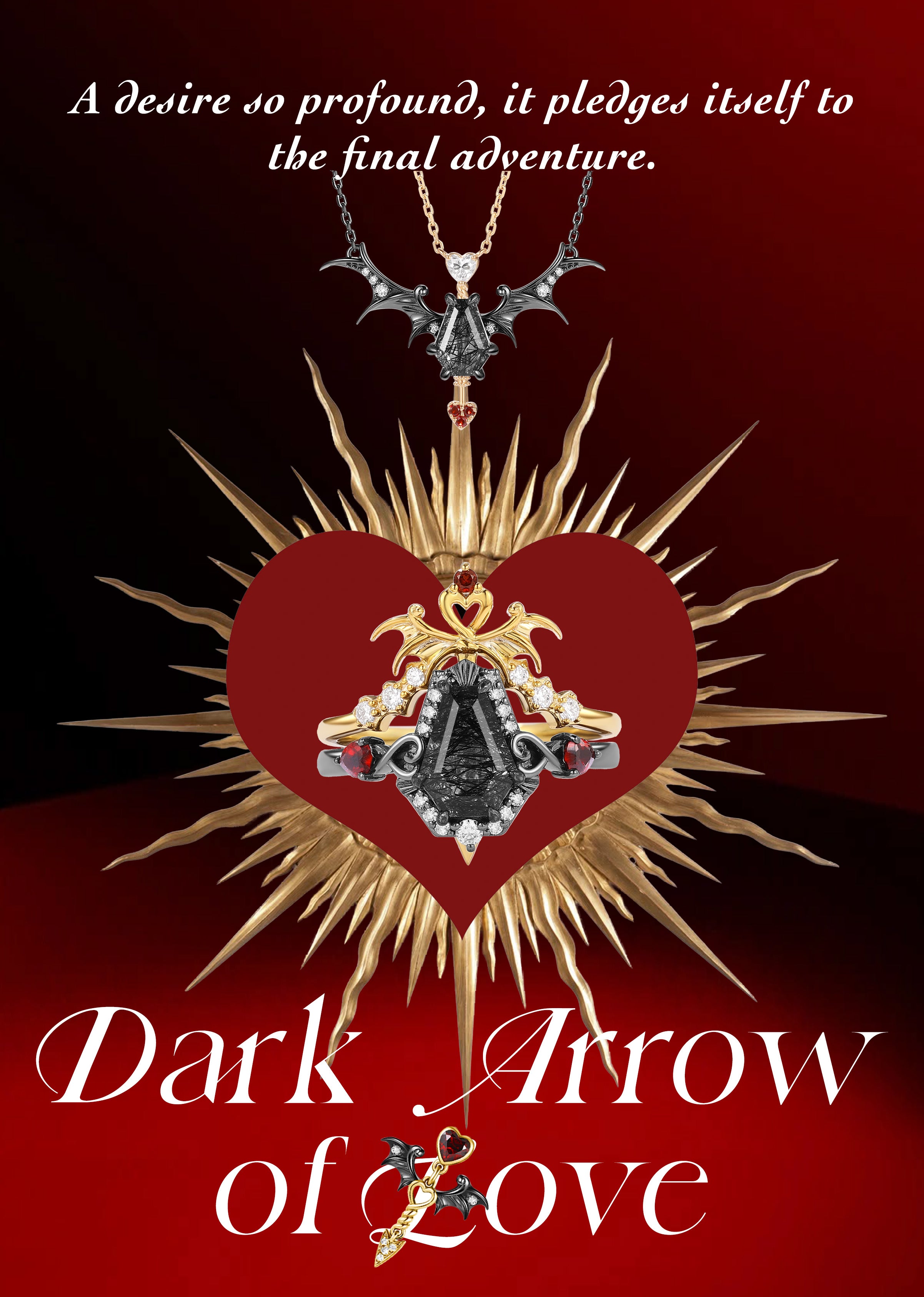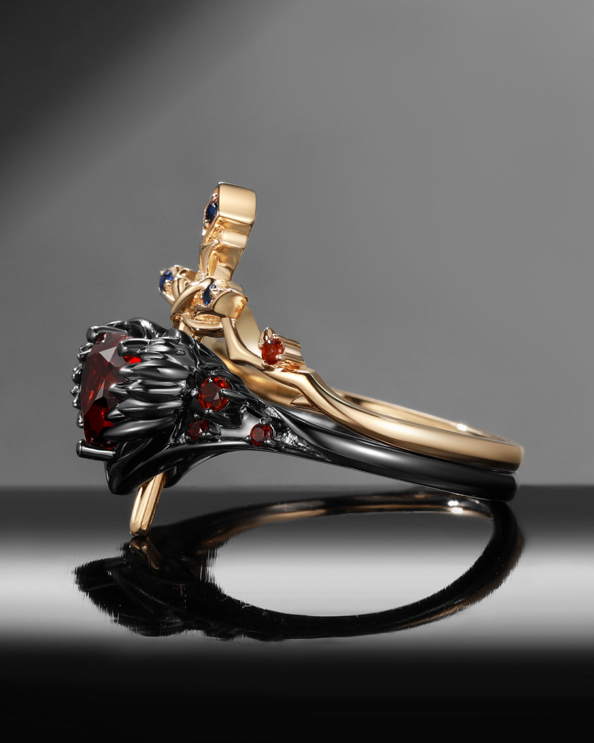 Gothic Inspired 'Dark Romance' Coffin Shaped Garnet Black Gold Engagement Ring Set 2pcs