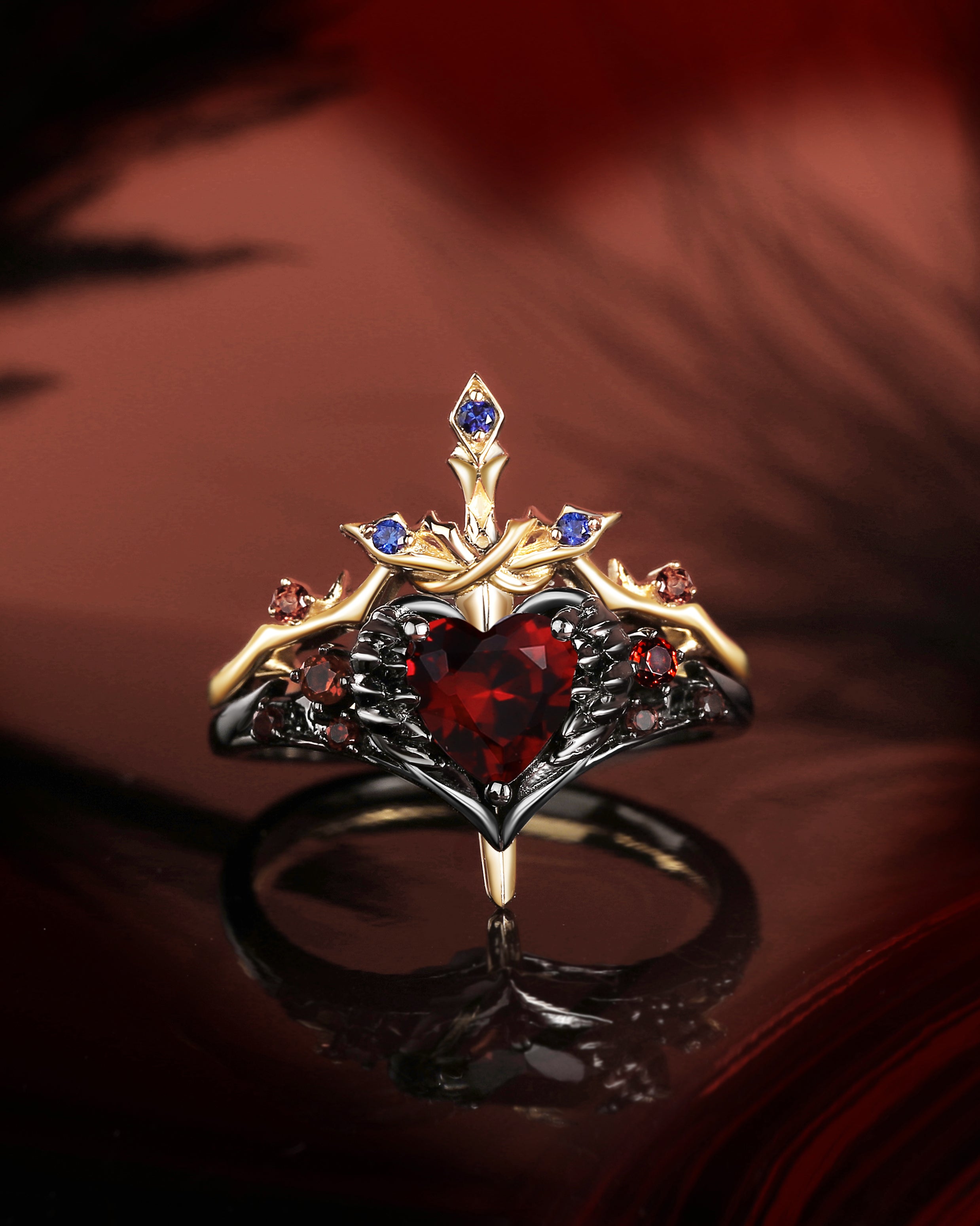 Crescent Moon | Coffin Cut Garnet Black Gold Engagement Ring Set 2pcs- 'Ultra Galaxy'