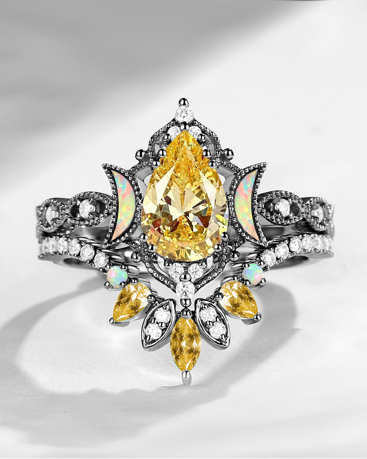 Crescent Moon | Pear Cut Moonstone Black Gold Engagement Ring Set 2PCS 18K