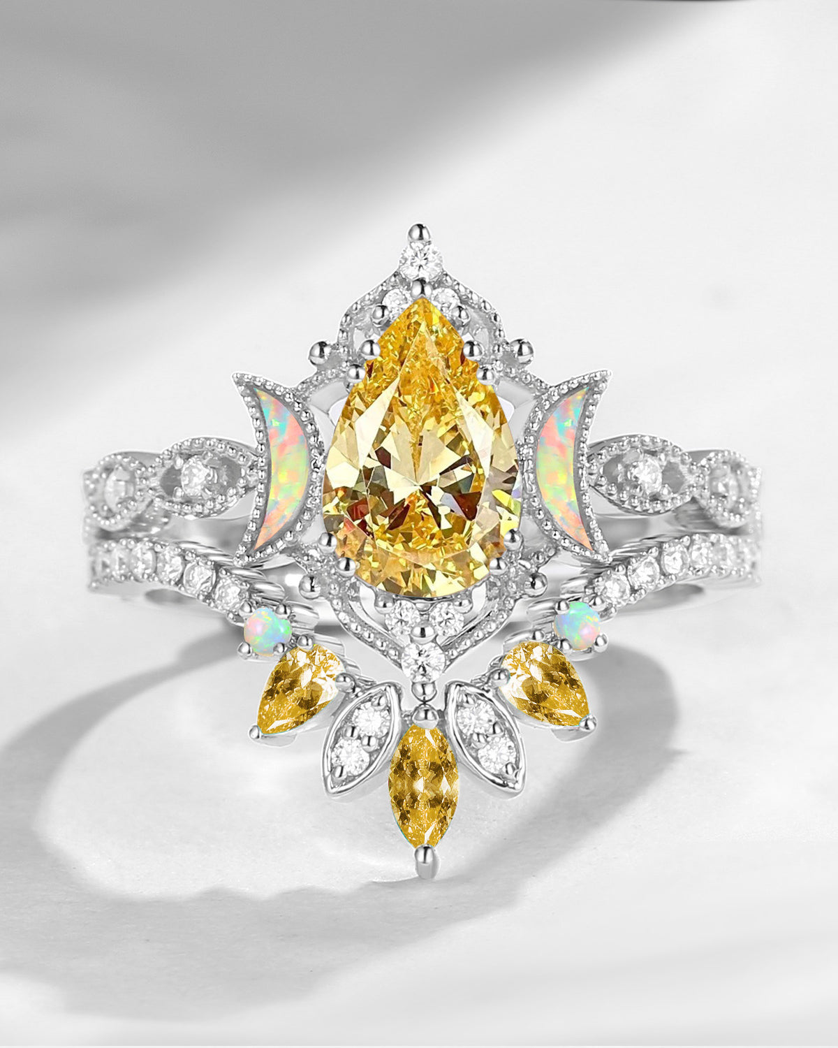Crescent Moon | Pear Cut Lab Diamond 'Ultra Galaxy' Lab Opal Engagement Ring Set 2pcs