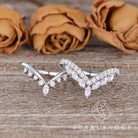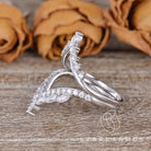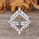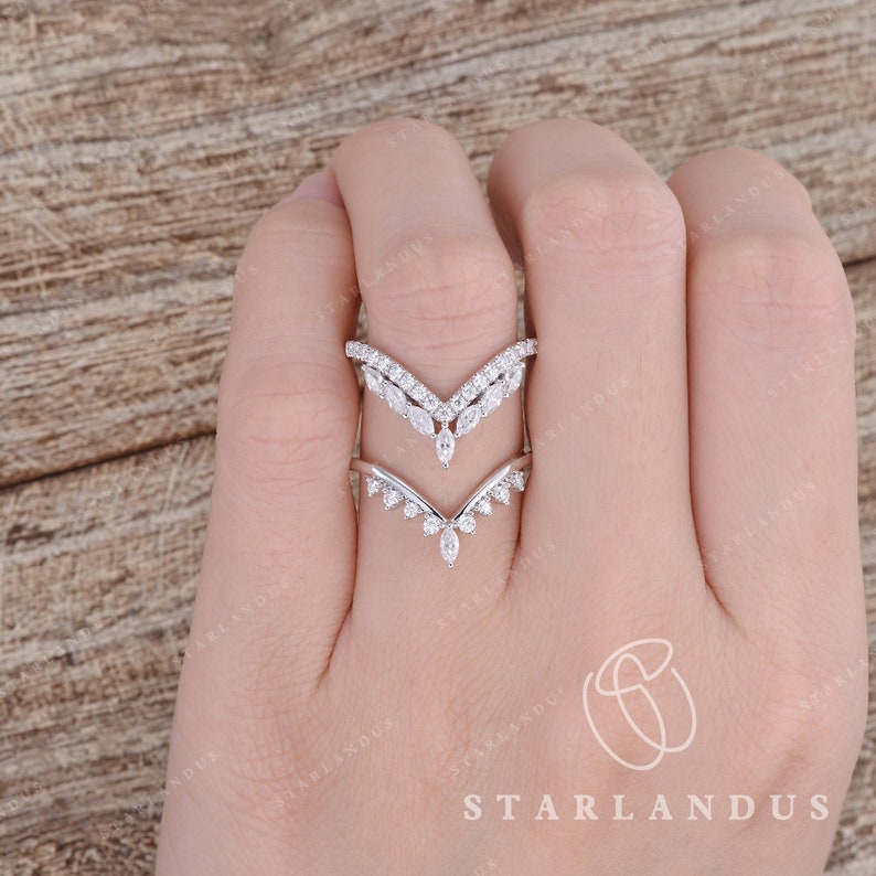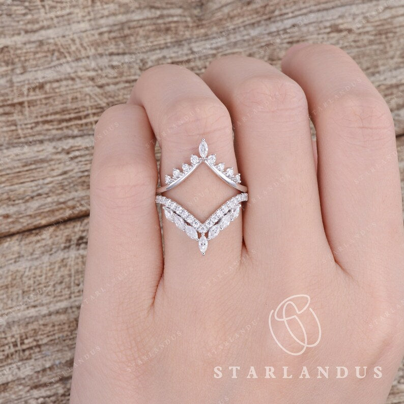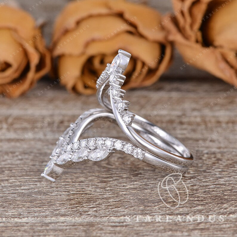 Custom Curved White Gold Wedding Band Women Marquise Moissanite  Ring Moissanite Band Chevron Ring Guard Angel Cluster Ring 2pcs