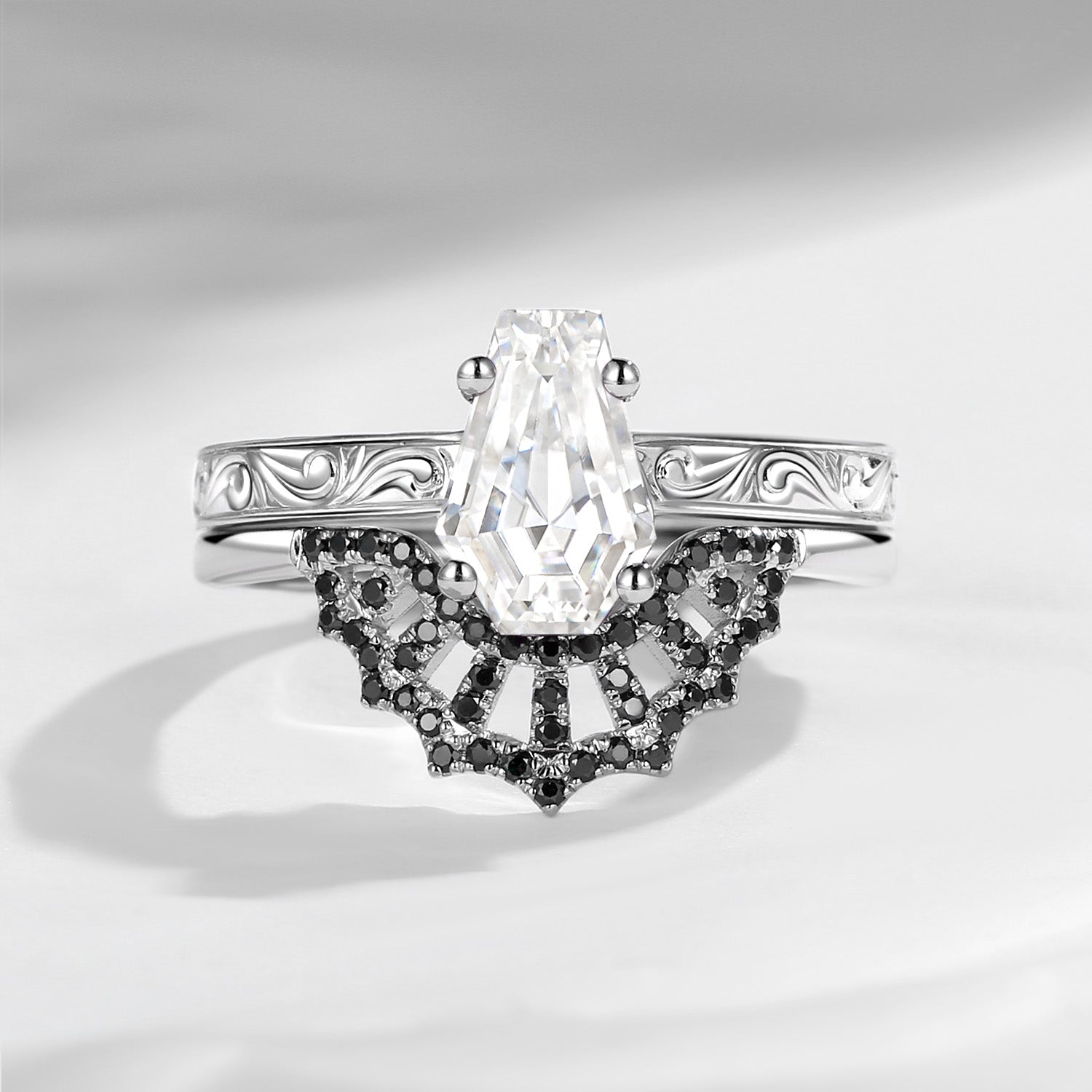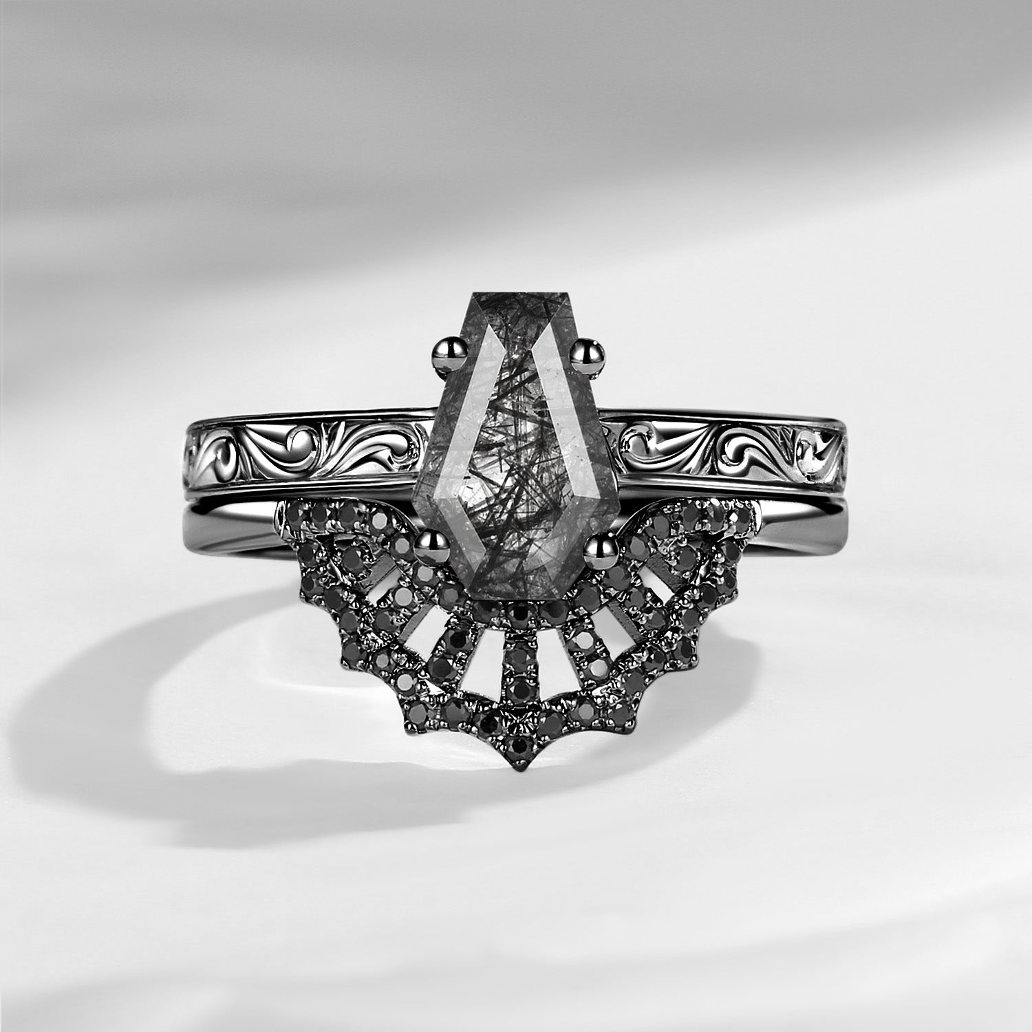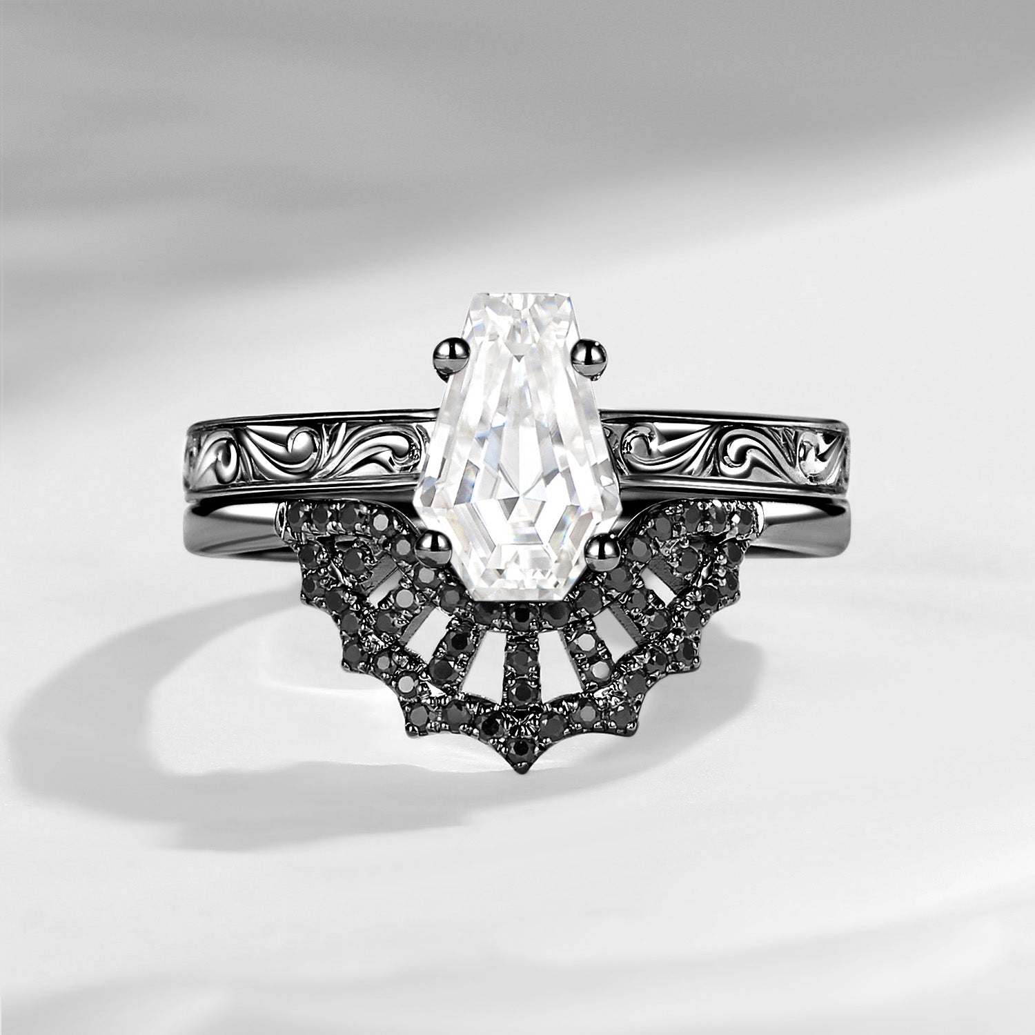 Vintage Filigree Coffin Spider Web Moissanite Black Gold Engagement Ring Set 2pcs