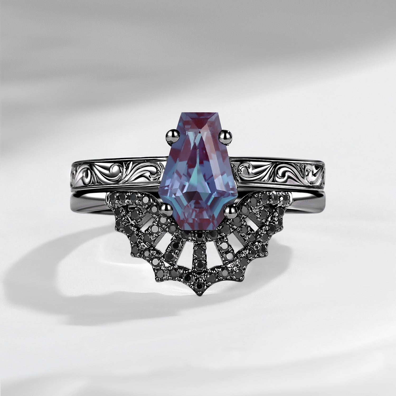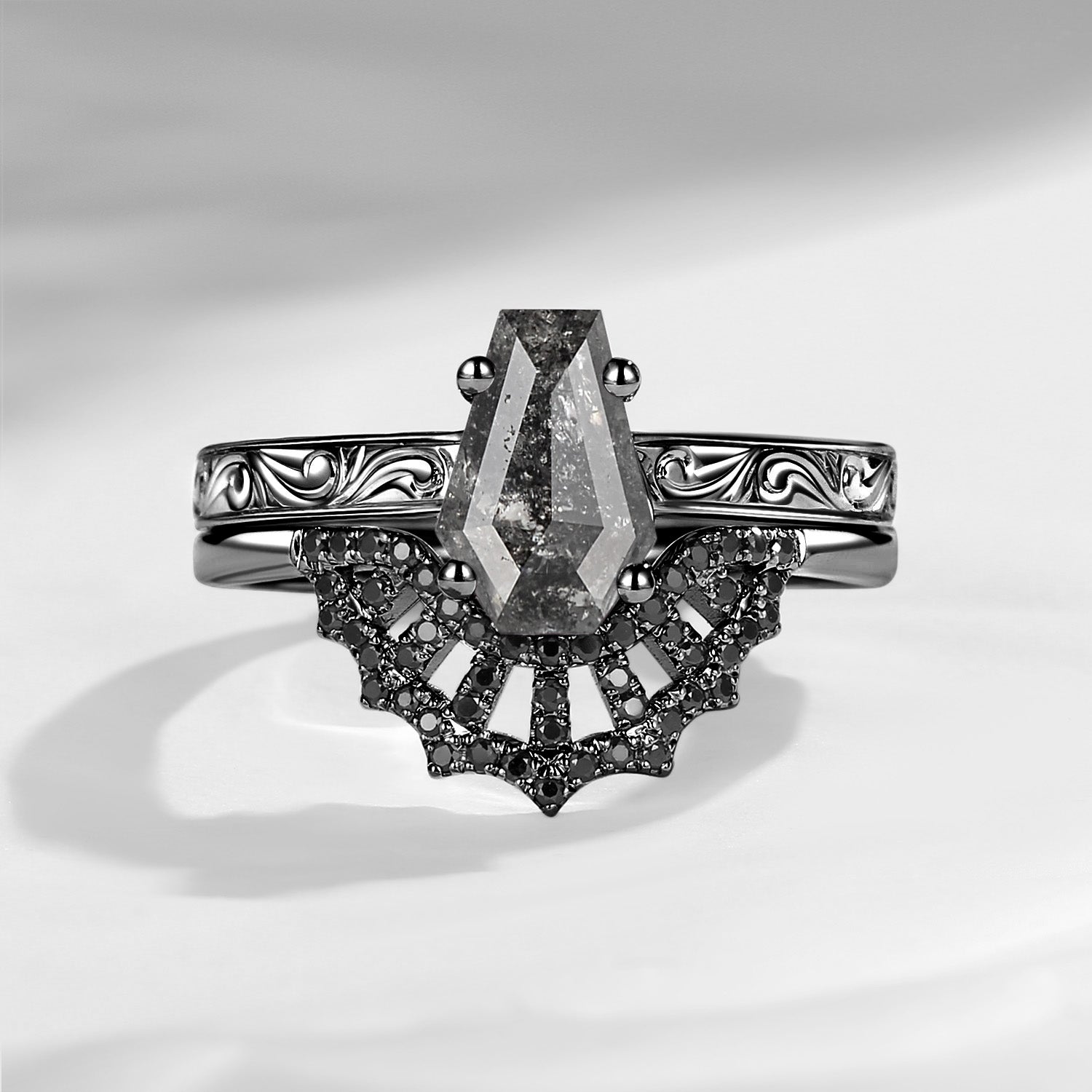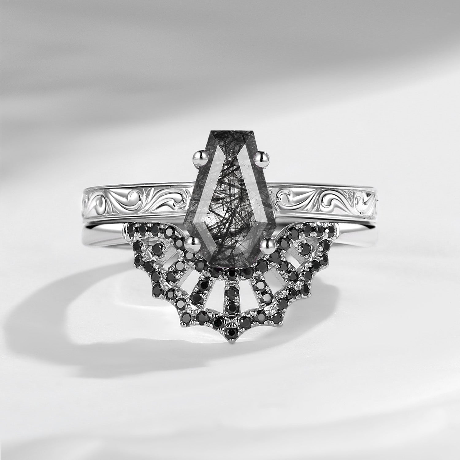 Vintage Filigree Coffin Spider Web Moissanite Black Gold Engagement Ring Set 2pcs
