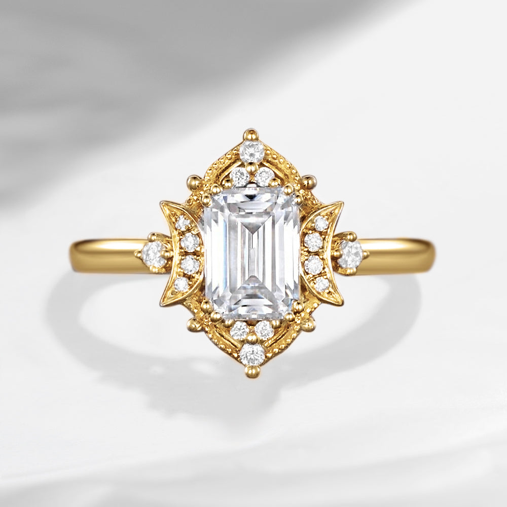 Crescent moon | Vintage Style Emerald Cut Moissanite Engagement Ring