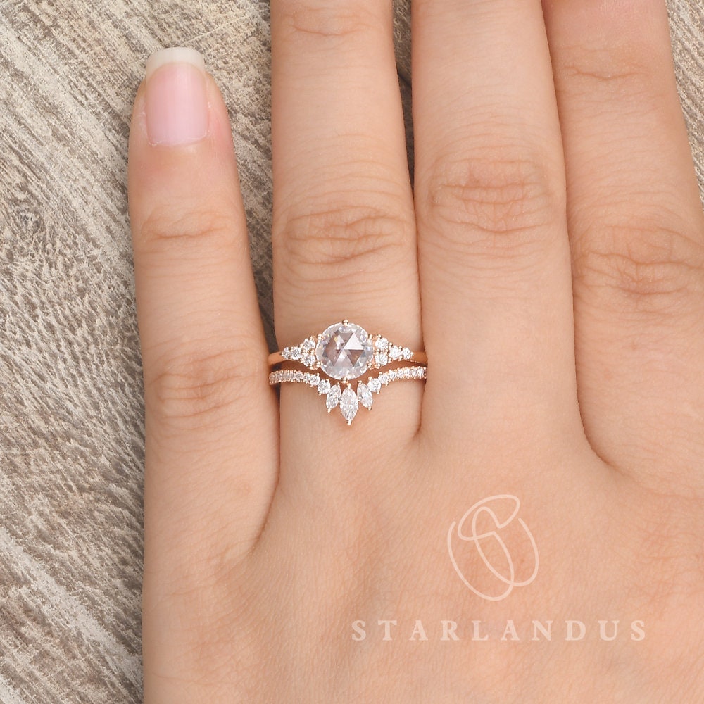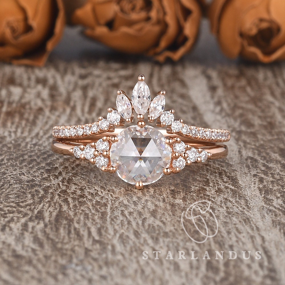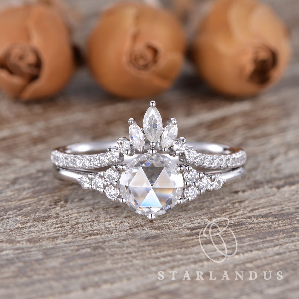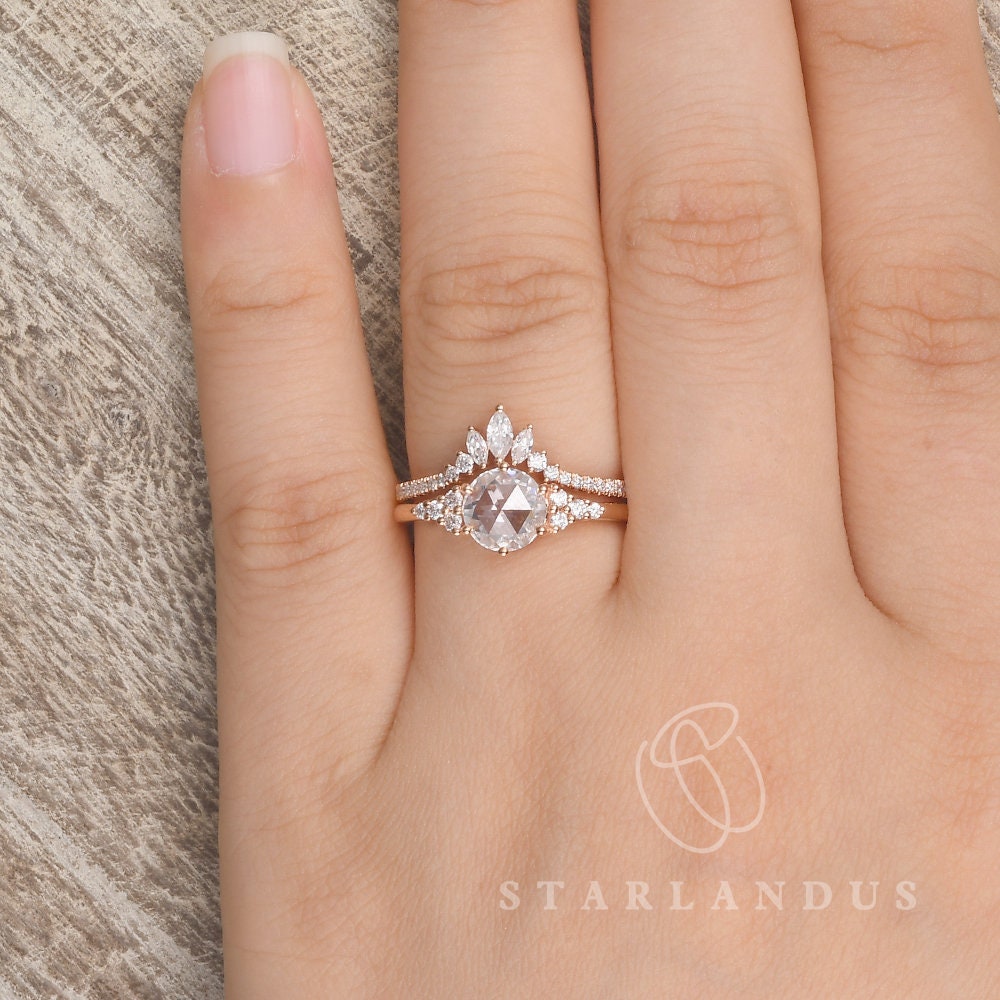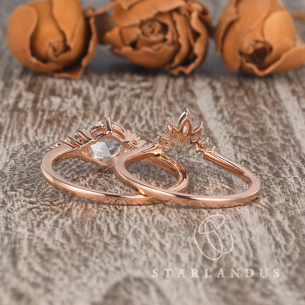 Unique Rose Cut Moissanite Engagement Ring Set 2PCS
