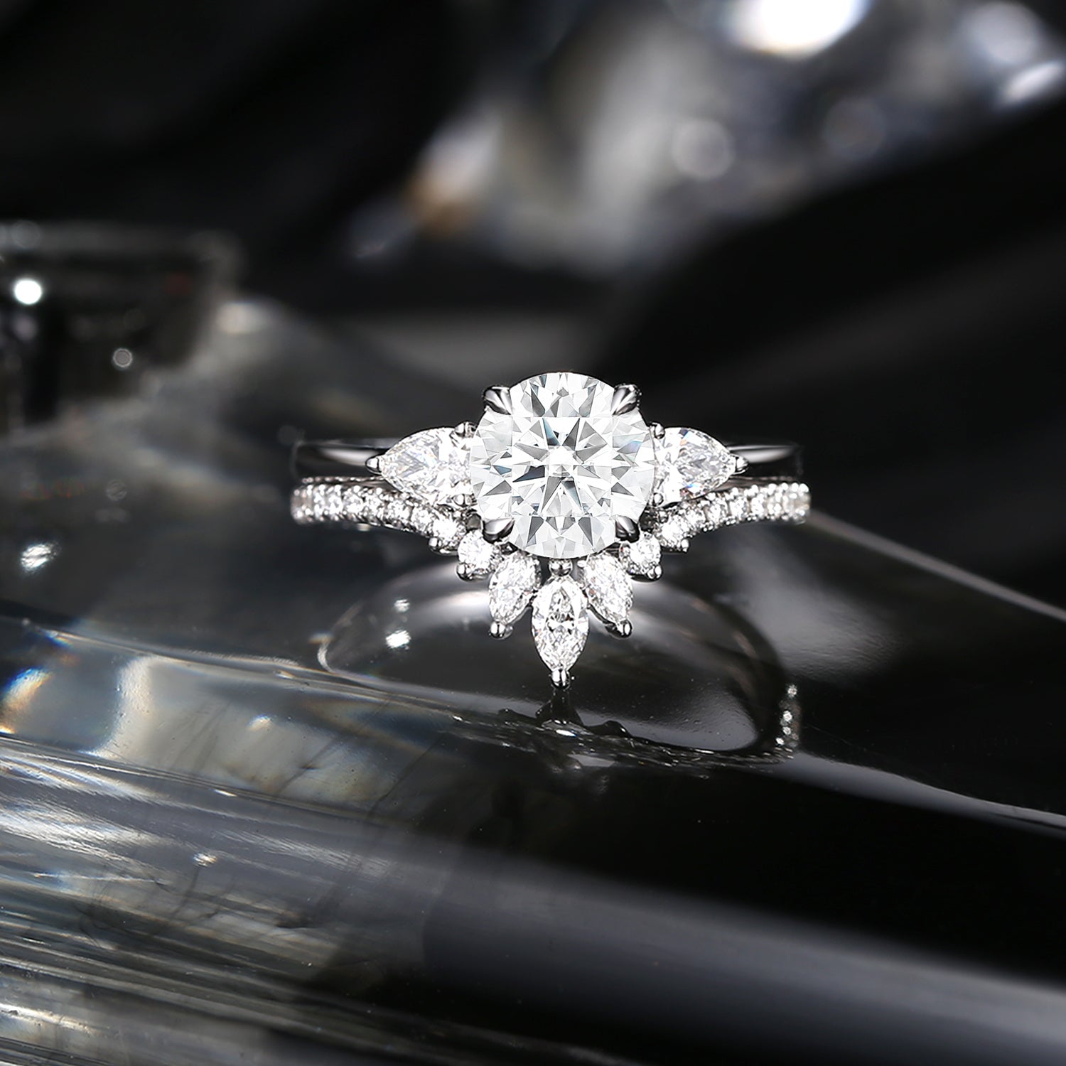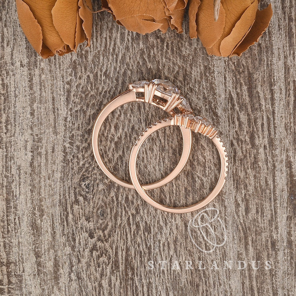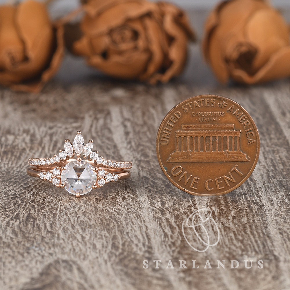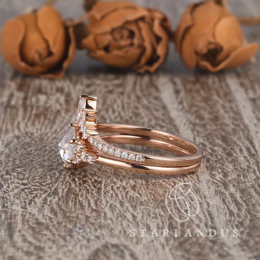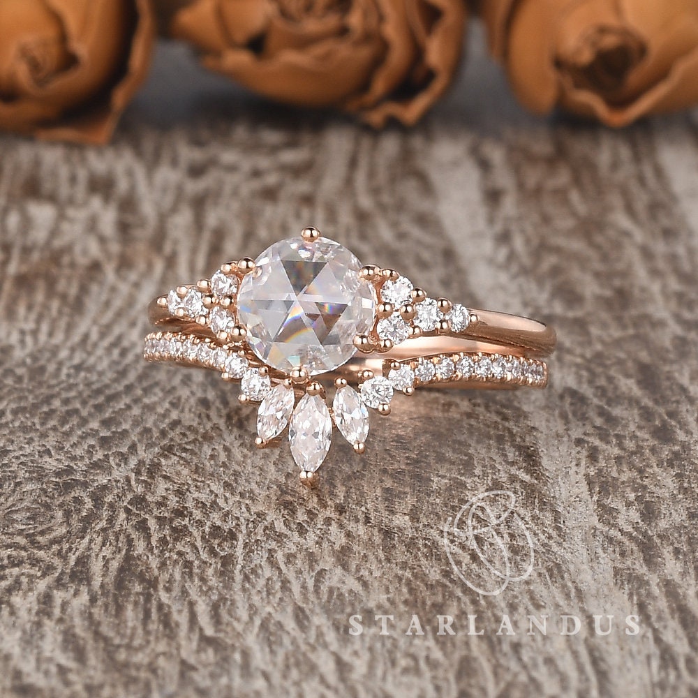Unique Rose Cut Moissanite Engagement Ring Set 2PCS
