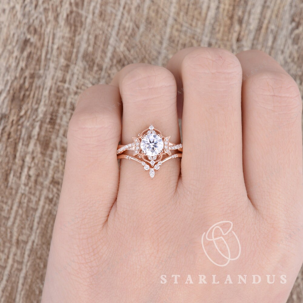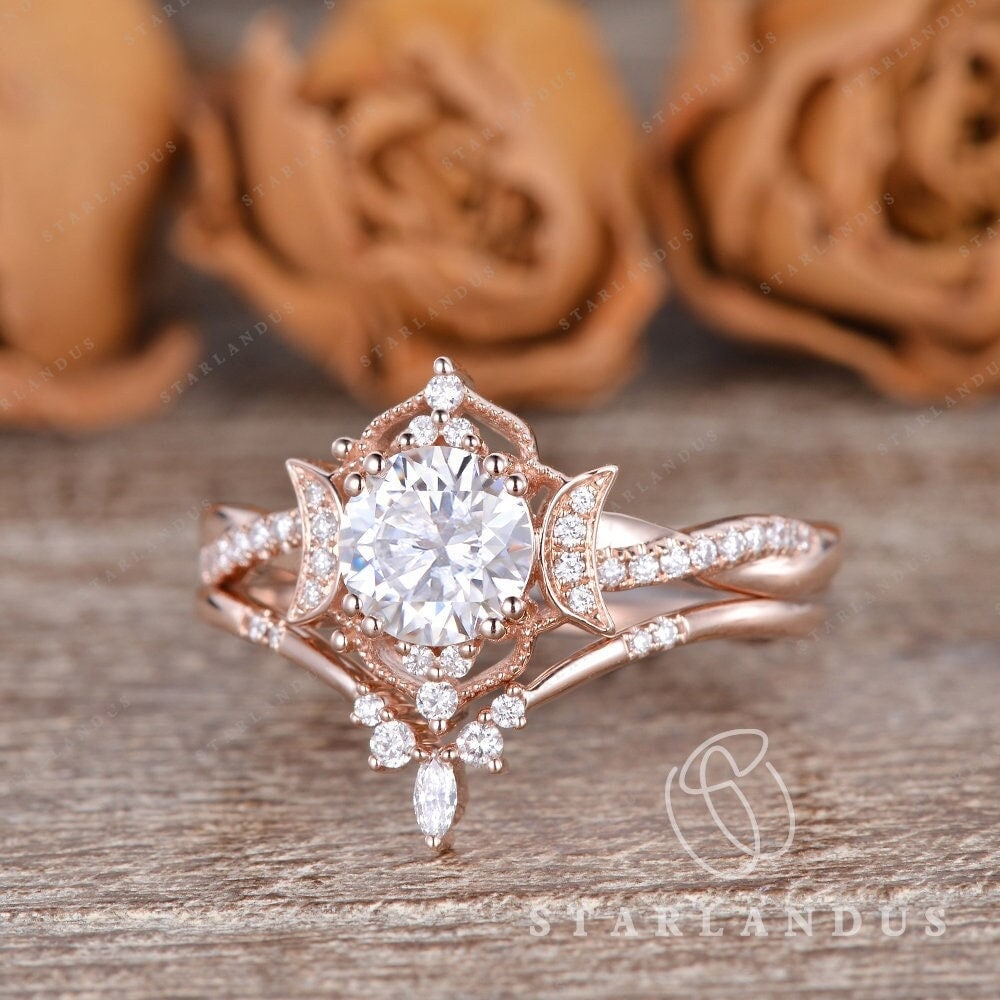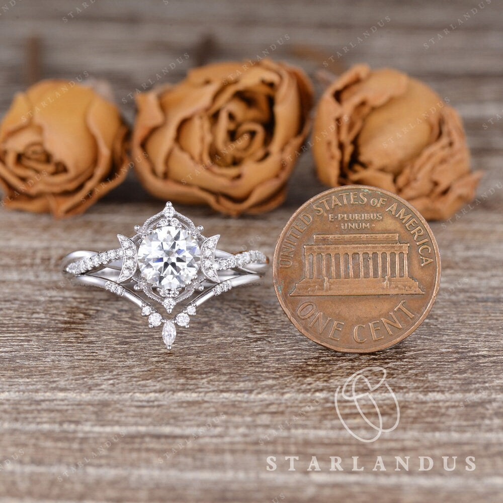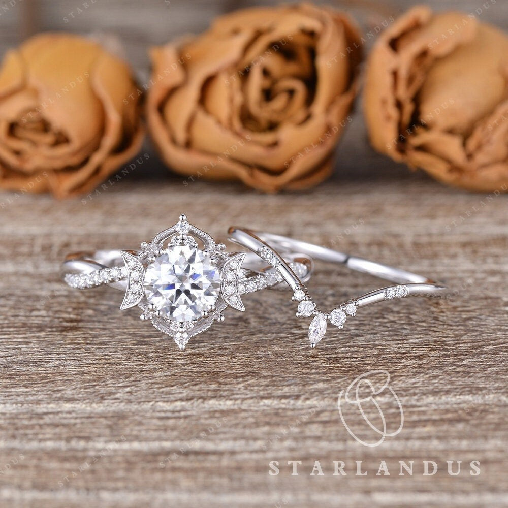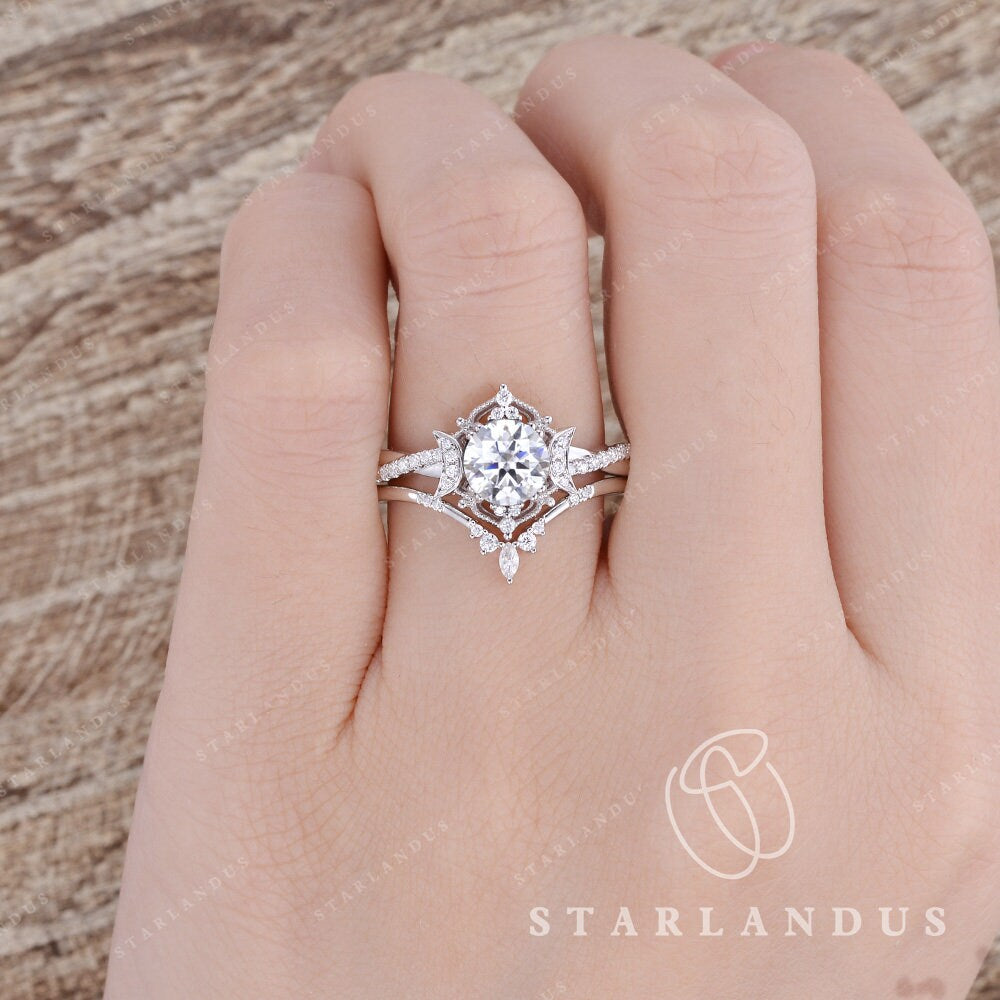 Crescent Moon | Vintage Style Emerald Cut Moissanite Engagement Ring Set 2PCS
