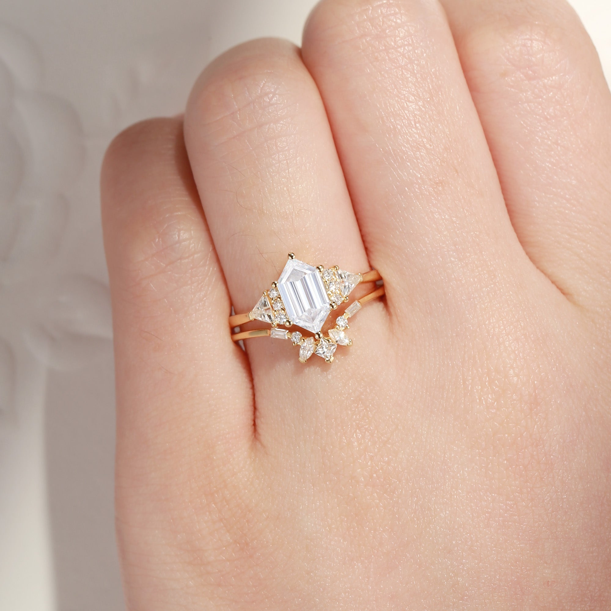 Classic Cluster Long Hexagon Cut Moissanite Engagement Ring Set 2pcs