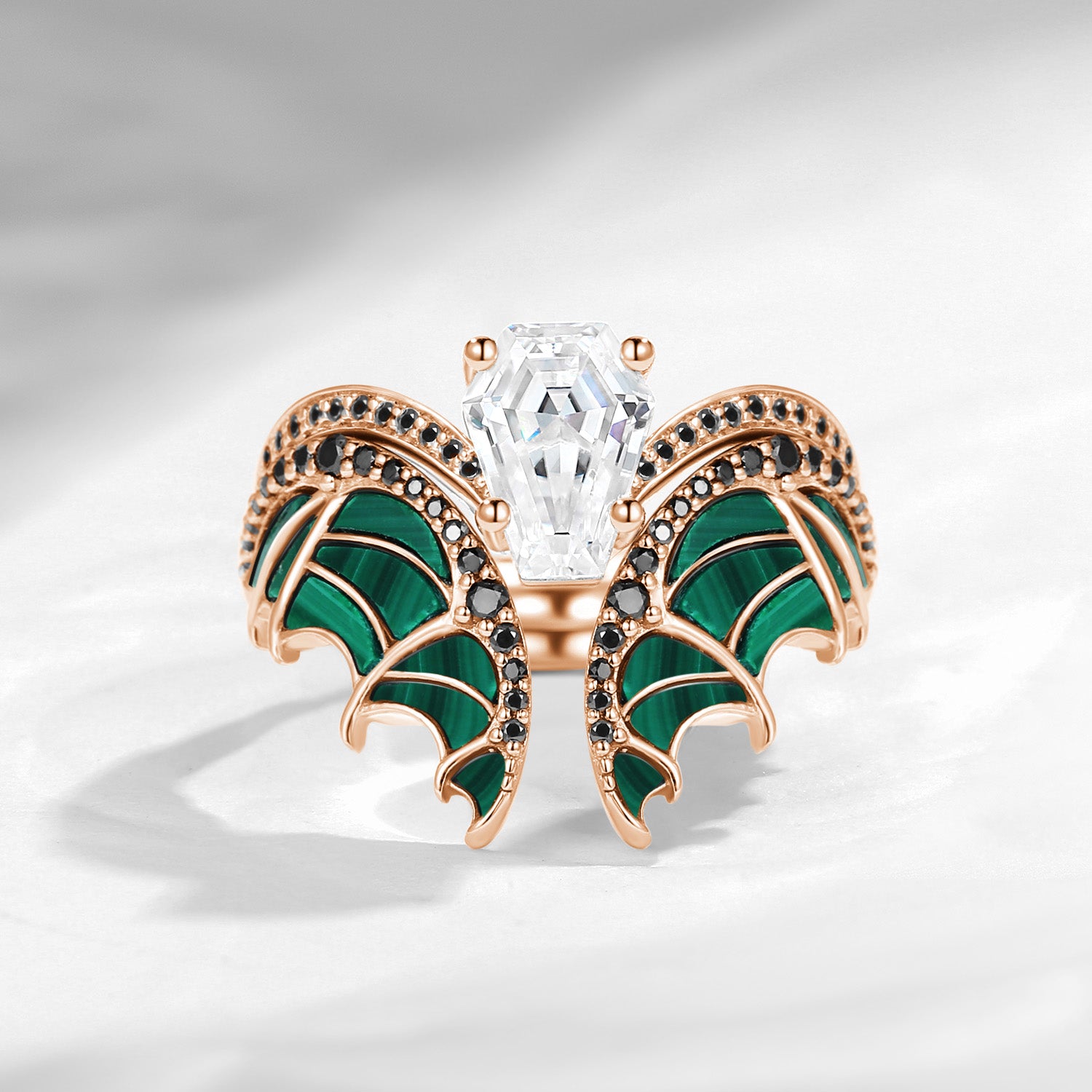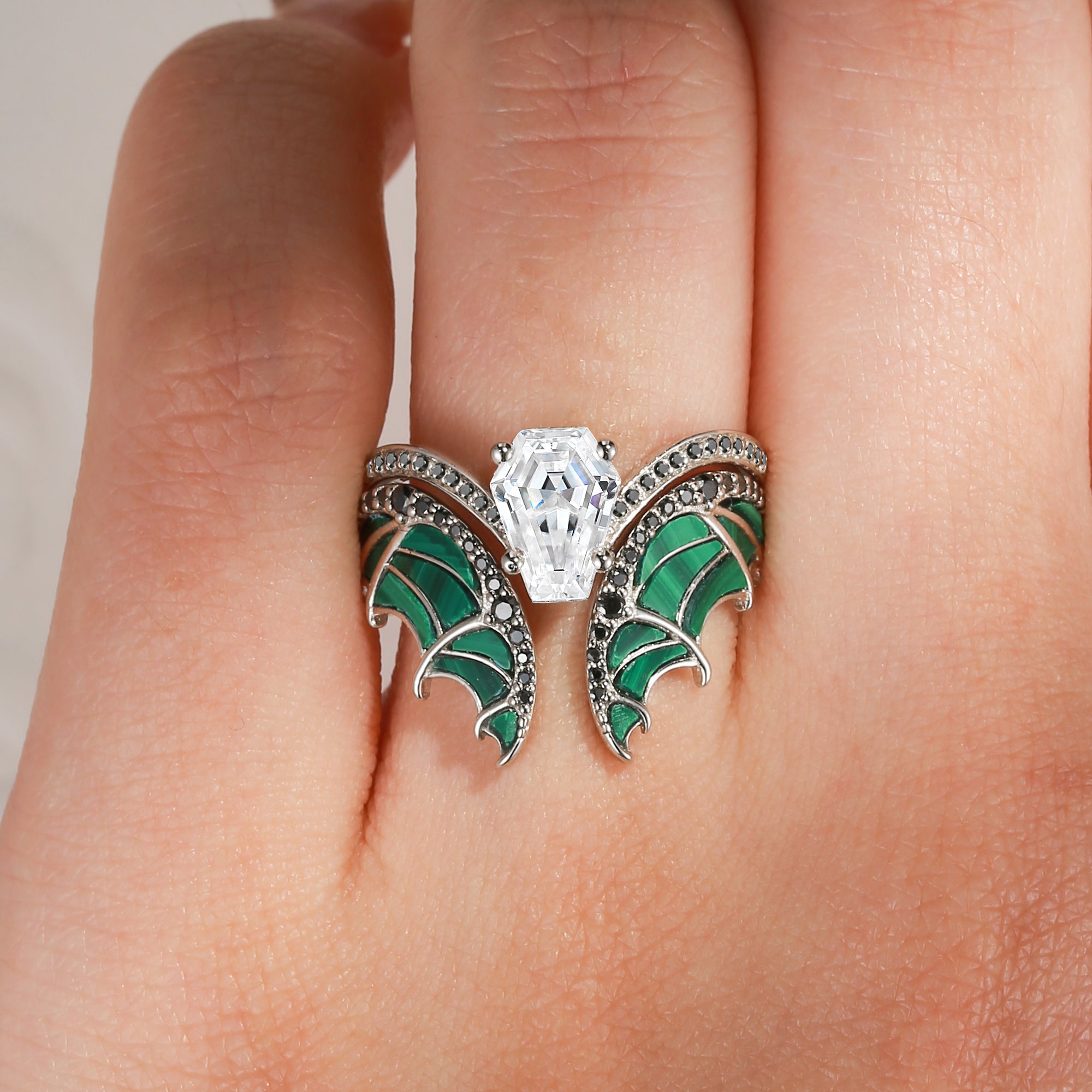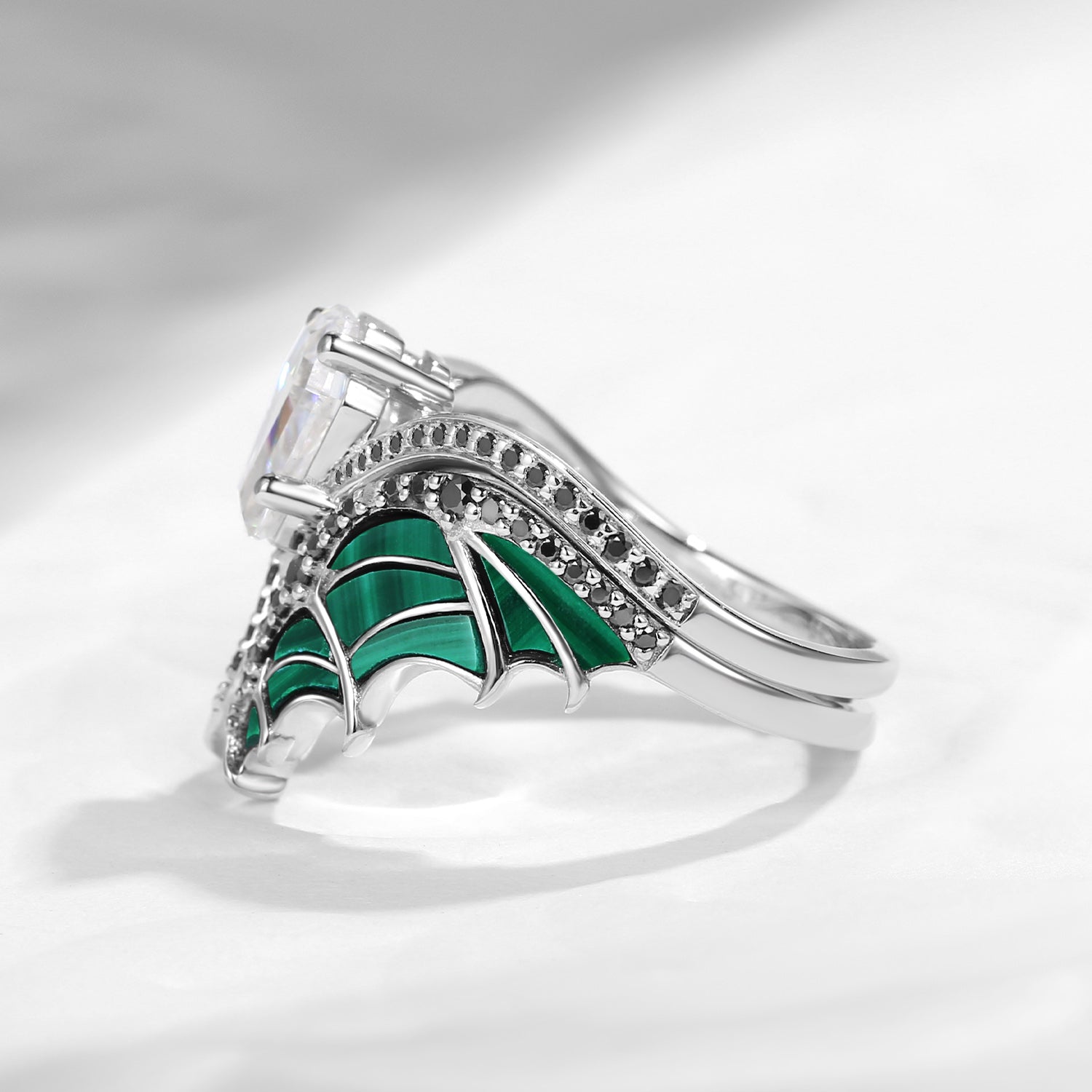Unique Coffin Cut Moissanite Malachite Bridal Set 2pcs - Bat Ring